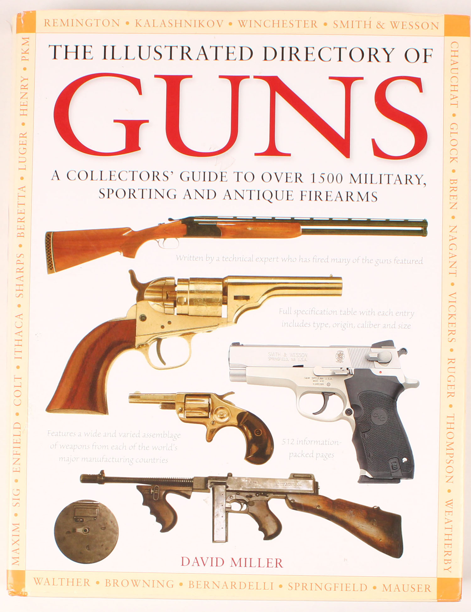 The Illustrated Directory of Guns: A Collector's Guide to Over 1500 Military, Sporting and Antique Firearms by David Miller 2011, 9'' x 12''. 511 pages, pages clean, binding tight, hardcover and dustjacket excellent, colored images. Value: $130 Grade: Excellent ++ - Value: 2 to 100