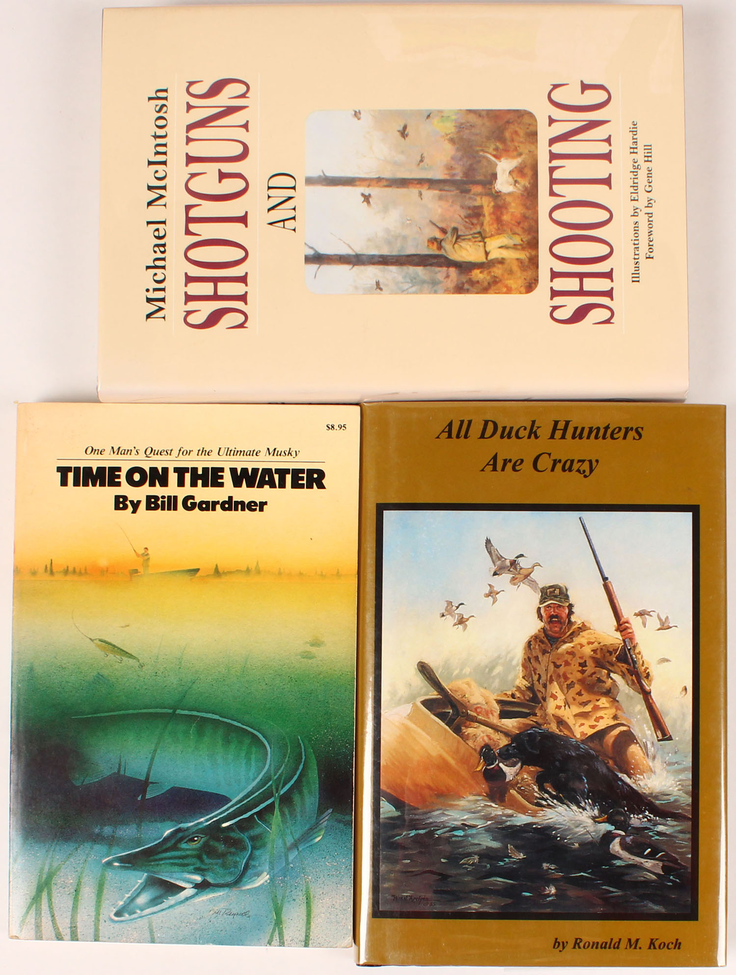 Lot of 3 (1) One Man's Quest for the Ultimate Musky: Time on the Water by Bill Gardner, 5 1/2'' x 8 1/2''. 206 pages. (1) All Duck Hunters Are Crazy by Ronald M. Koch, 6'' x 9''. 192 pages. (1) Shotguns and Shooting by Michael McIntosh, 6 1/2'' x 9 1/2''. 266 pages. Grade: Excellent - Value: 2 to 50