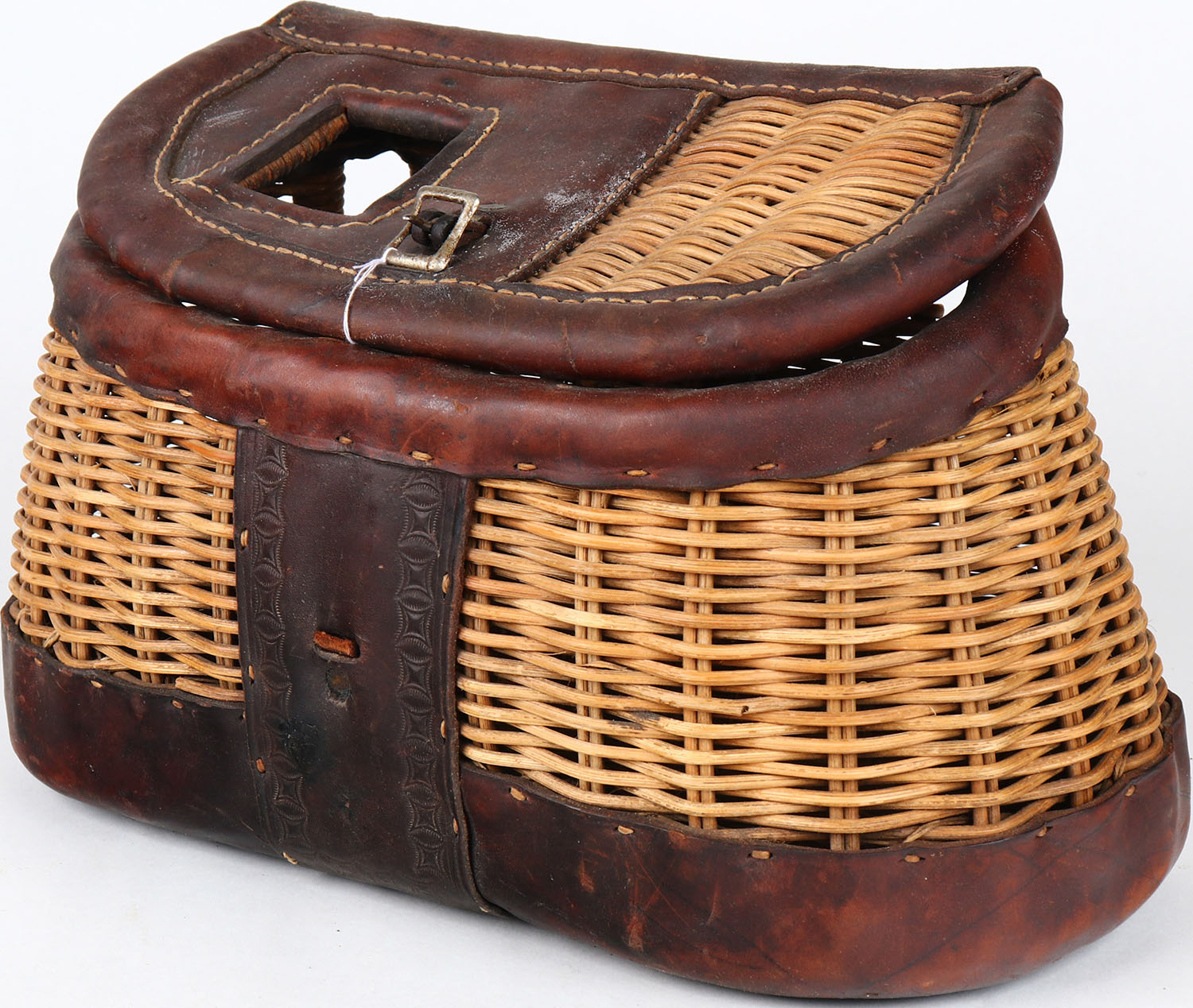 Unmarked Leather creel, some tooling to front, buckle on top is attached but strap is gone, 14 at base, weave on basket has no damage, leather hanging strap is missing, nice creel. Grade: Very Good ++ - Value: 30 to 100