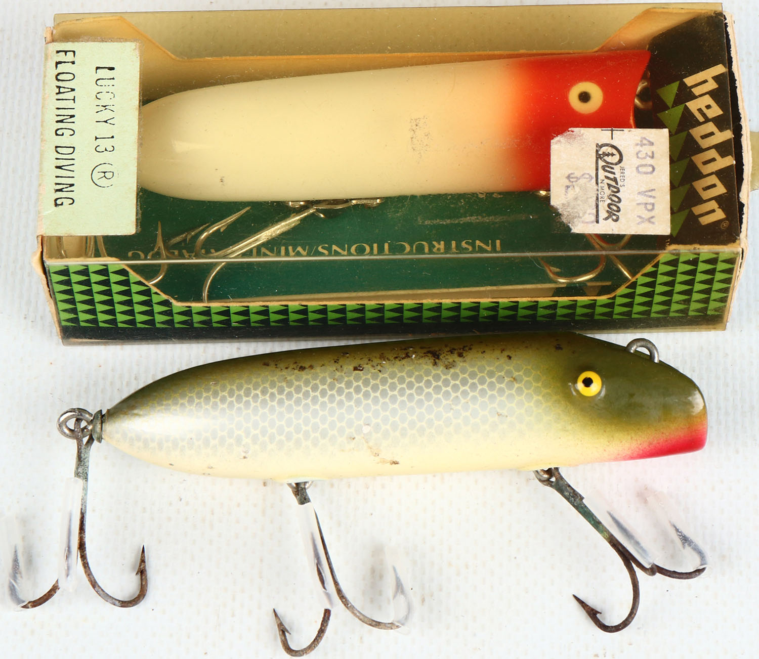 Lot of 2 lures one in original package, plastic lure, Heddon Lucky 13 Floating Diving, unmarked South Bend lure?. Grade: Excellent - Value: 10 to 50