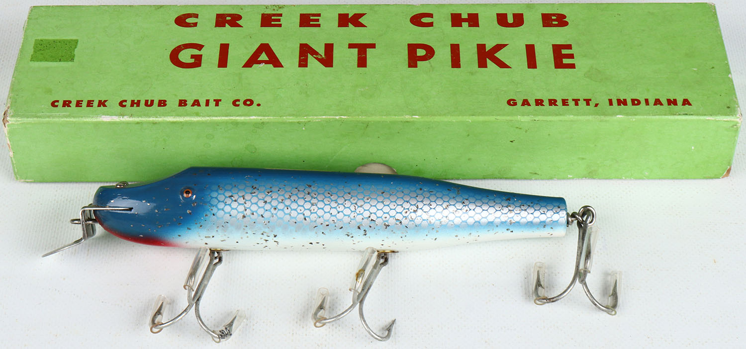 Creek Chub Giant Pikie in original box, blue scale, TE, 3 hook, has label on top of lure so unfished. Grade: Excellent ++ - Value: 20 to 80