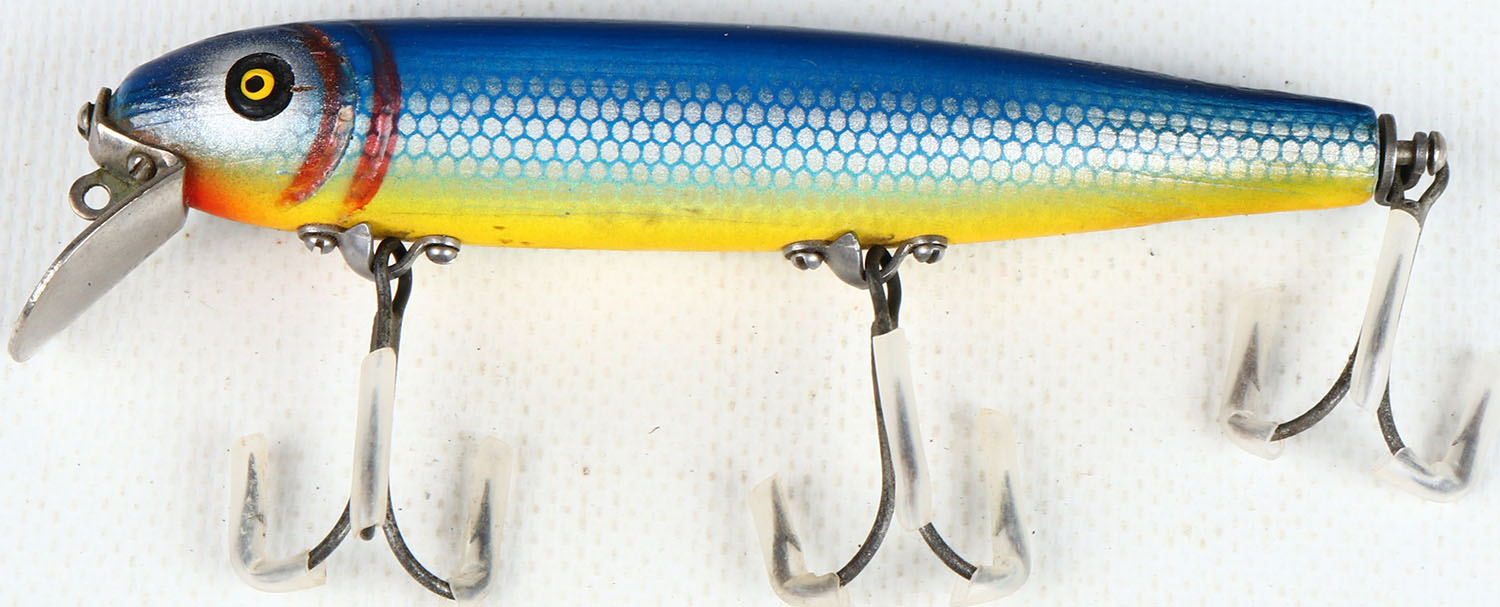 Pflueger Mustang, blue/yellow scale, PE, 3 hooks, marked lip, has no metal plates top & bottom, has one lie tie. Grade: Excellent - Value: 10 to 50