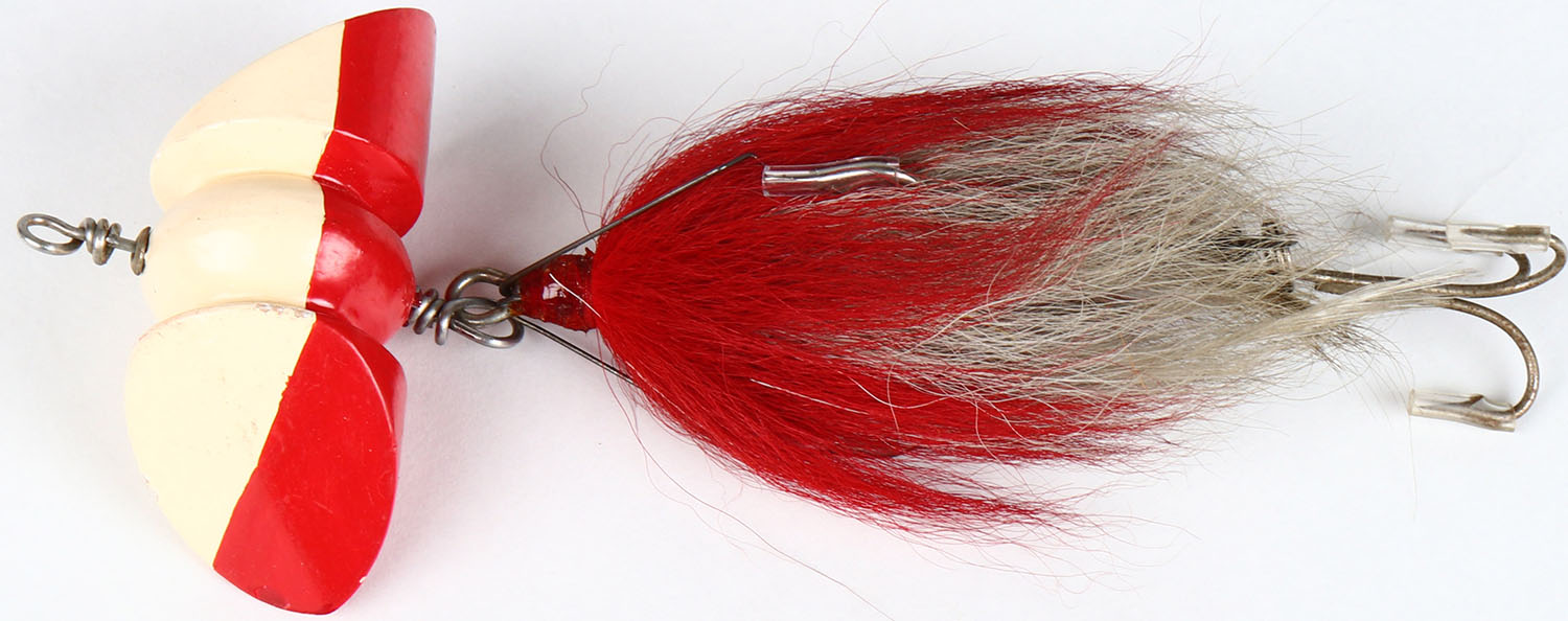 South Bend Whiri-Oreno with feather skirt, no eyes, red & white, 2 hooks & skirts, very nice condition. Grade: Excellent ++ - Value: 40 to 100