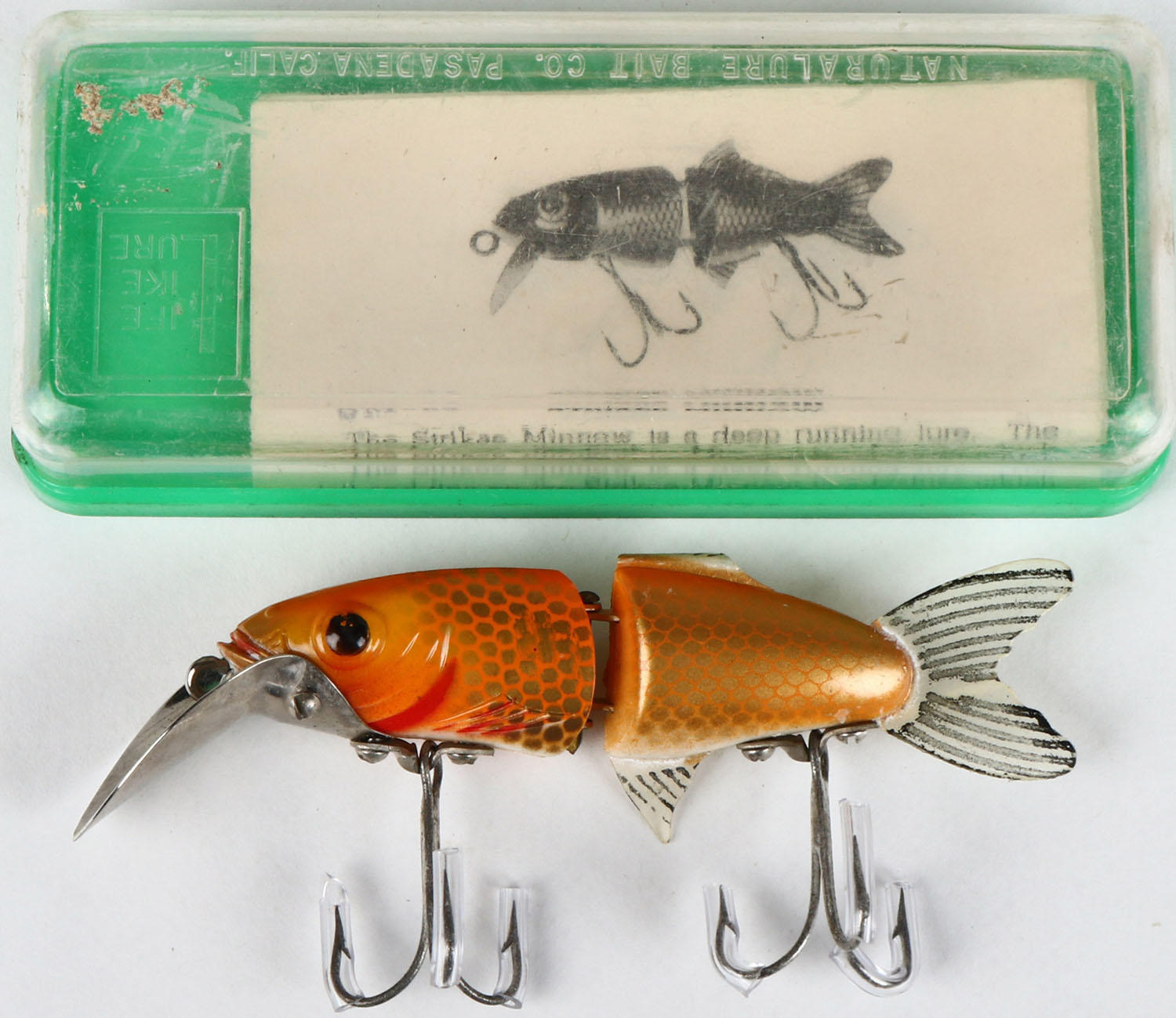 Jointed lure, gray/yellow scale in original box, has metal lip, PE, 2 hooks. Grade: Excellent + - Value: 6 to 30