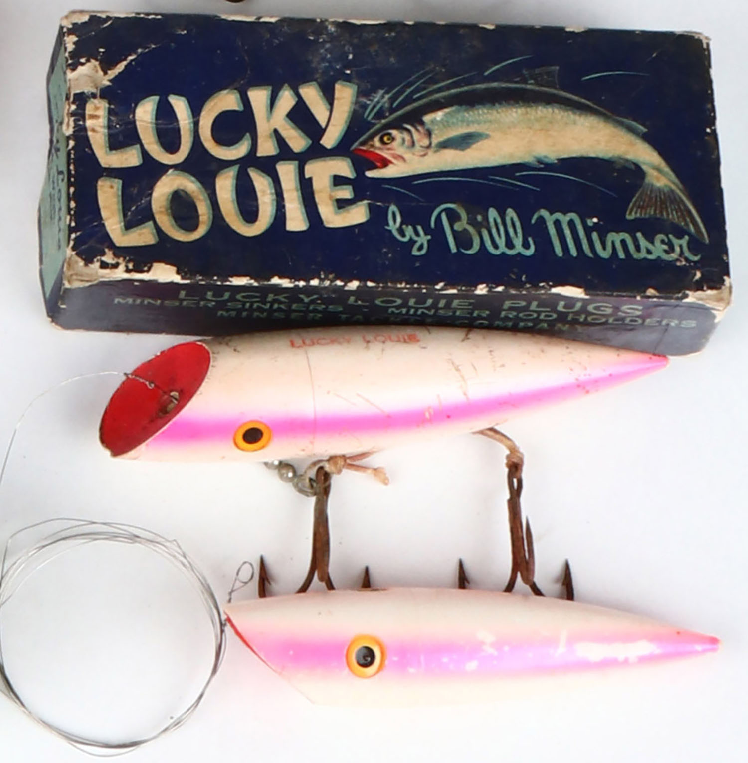 Lucky Louie Salmon Plug in the original box, has two lures, CE, well marked, white & pink. Grade: Very Good - Value: 10 to 40