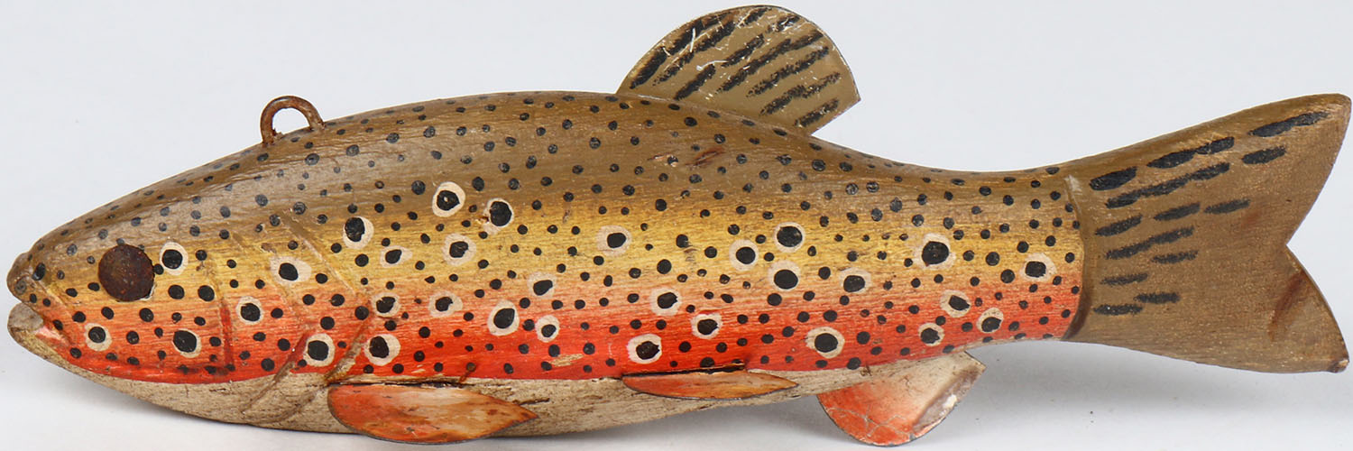 Unmarked Ice Fishing Decoy, TE, Trout, has 6 metal fins, 7 1/2'' OAL. Grade: Excellent - Value: 10 to 60