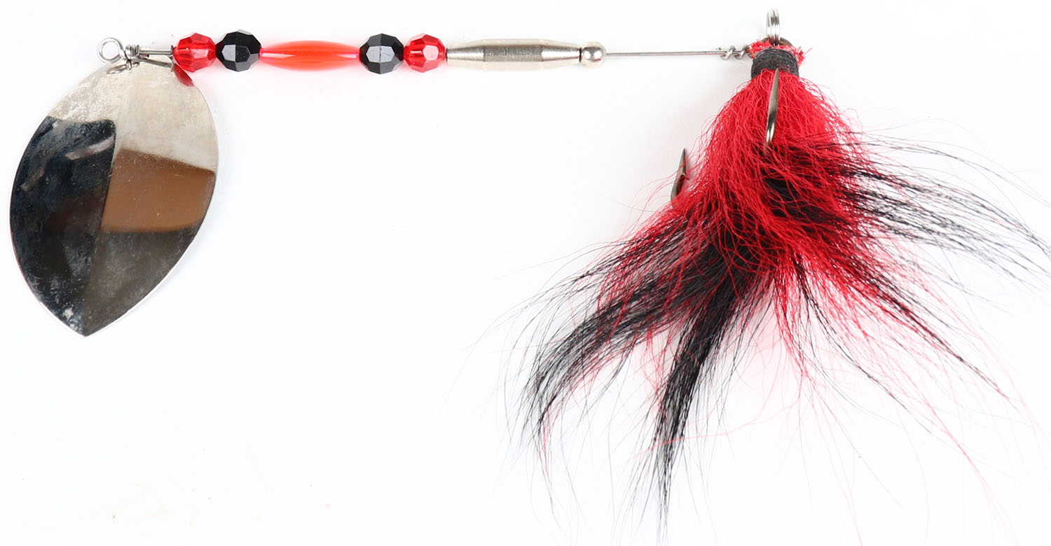 Unmarked large spinner with red & black feather skirt, 7 OAL. Grade: Excellent ++ - Value: 2 to 30