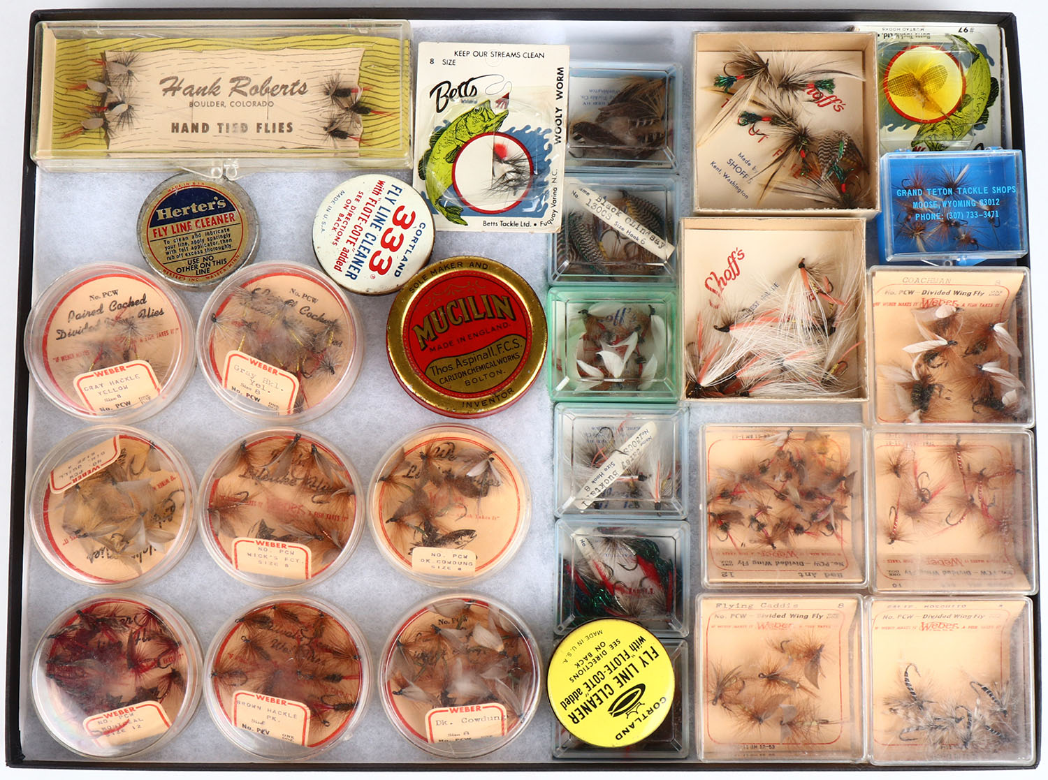 Shadow box full of flies in original boxes or containers, plus other fly fishing items, 16'' x 12''. Grade: Excellent - Value: 6 to 30