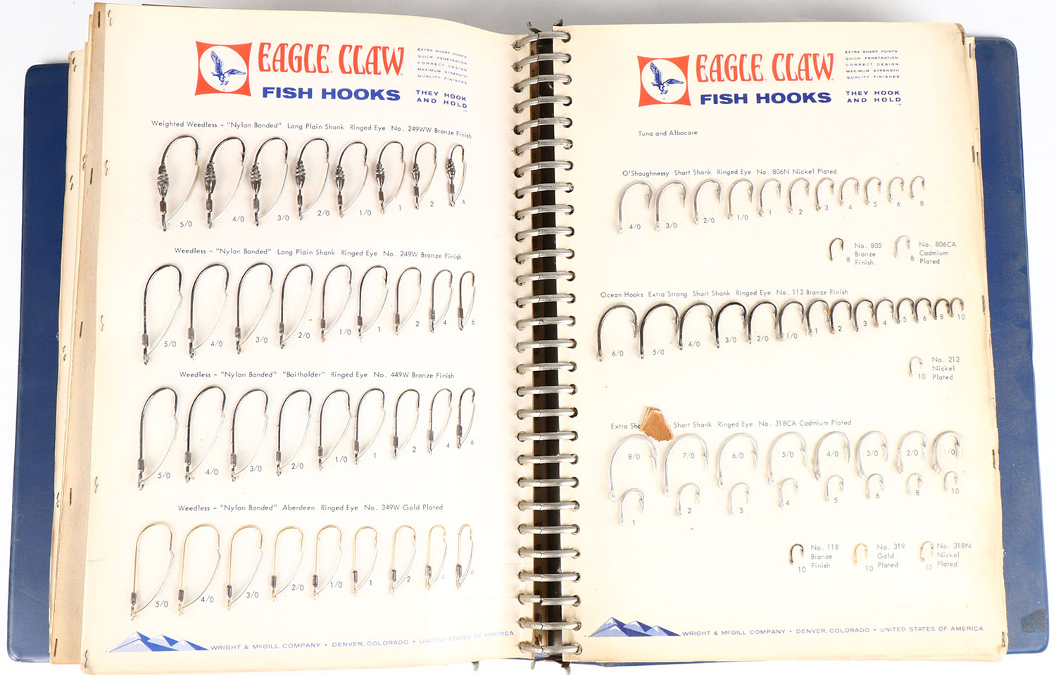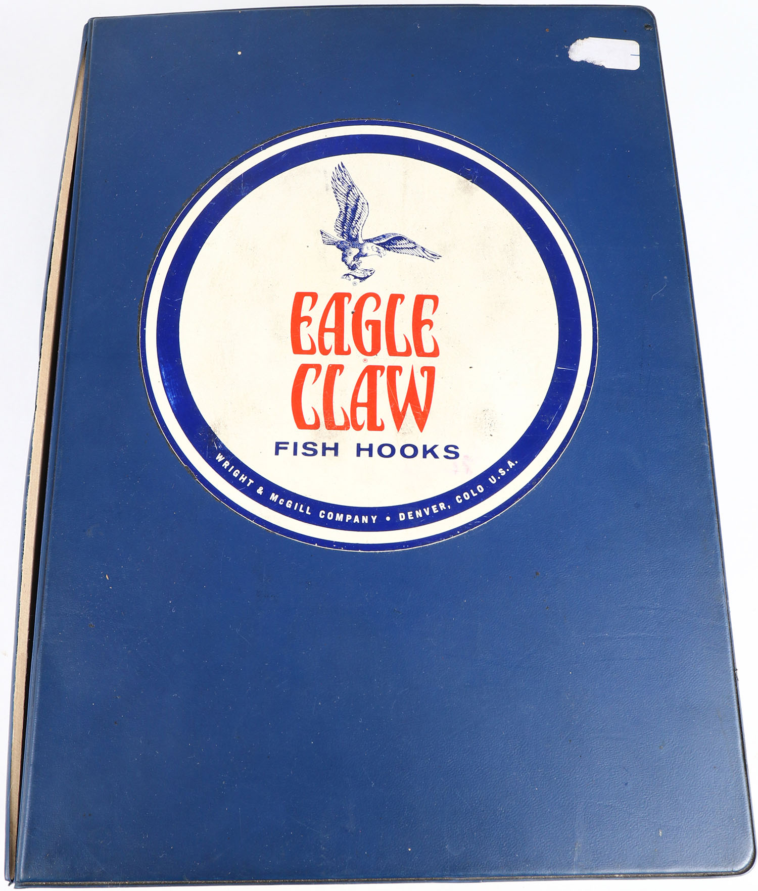 7555. Eagle Claw, 12 full cards of hooks of all sizes in side of marked 3 ring binder, Denver Colorado. Grade: Excellent + - Value: 20 to 200
