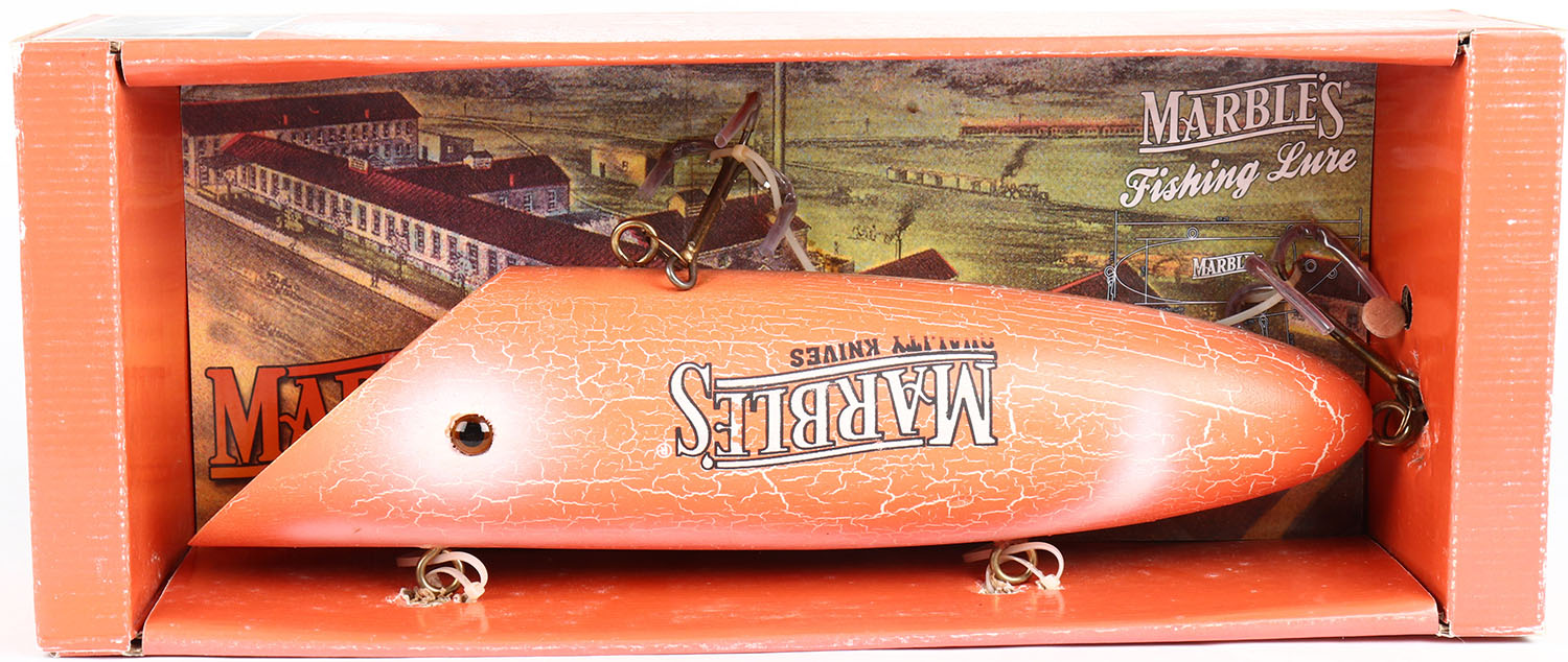 Marbles Large Display Fishing lure in original box, 19'' x 8: x 5''. Grade: Excellent ++ - Value: 20 to 200