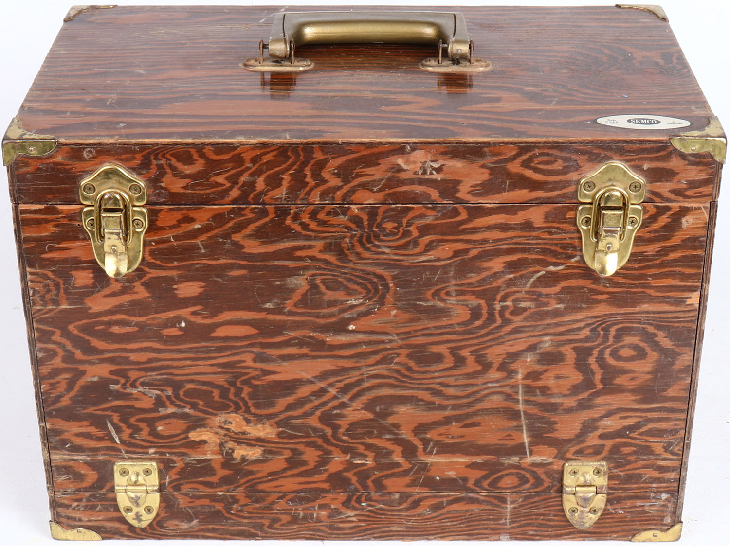 Fly Tying wooden box by Semco, full of thread, tools cutters, reels, 16'' x 11'' x 9''. Grade: Excellent - Value: 20 to 100