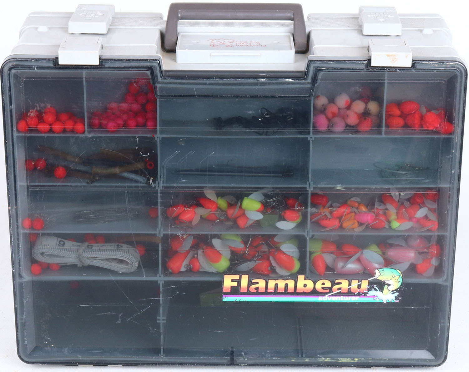 Steelhead/Salmon fishing tackle box by Flambeau, full of corkys, hotshots & other fishing gear, 15'' x 11'' x 7''. Grade: Excellent - Value: 10 to 80