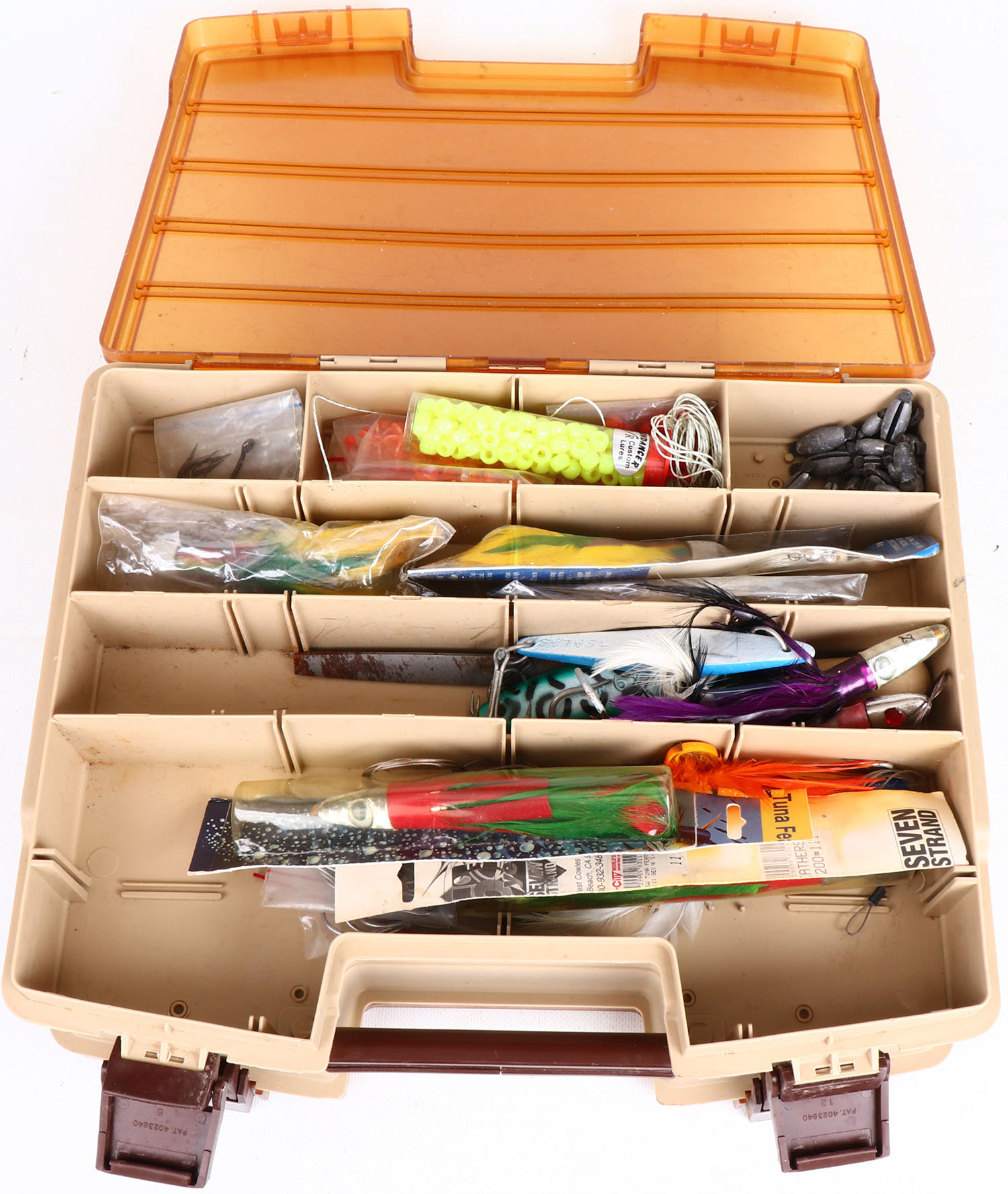 Fly Fishing Tackle Box full of flies for salmon, box made by Fenwick, 15'' x 12'' x 5''. Grade: Excellent - Value: 20 to 100