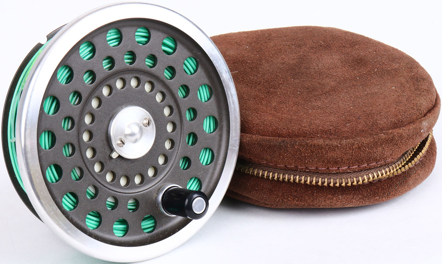Unmarked Fly Reel Spool, shows light wear, 3 1/2'' dia., has leather pouch. Grade: Excellent - Value: 10 to 50
