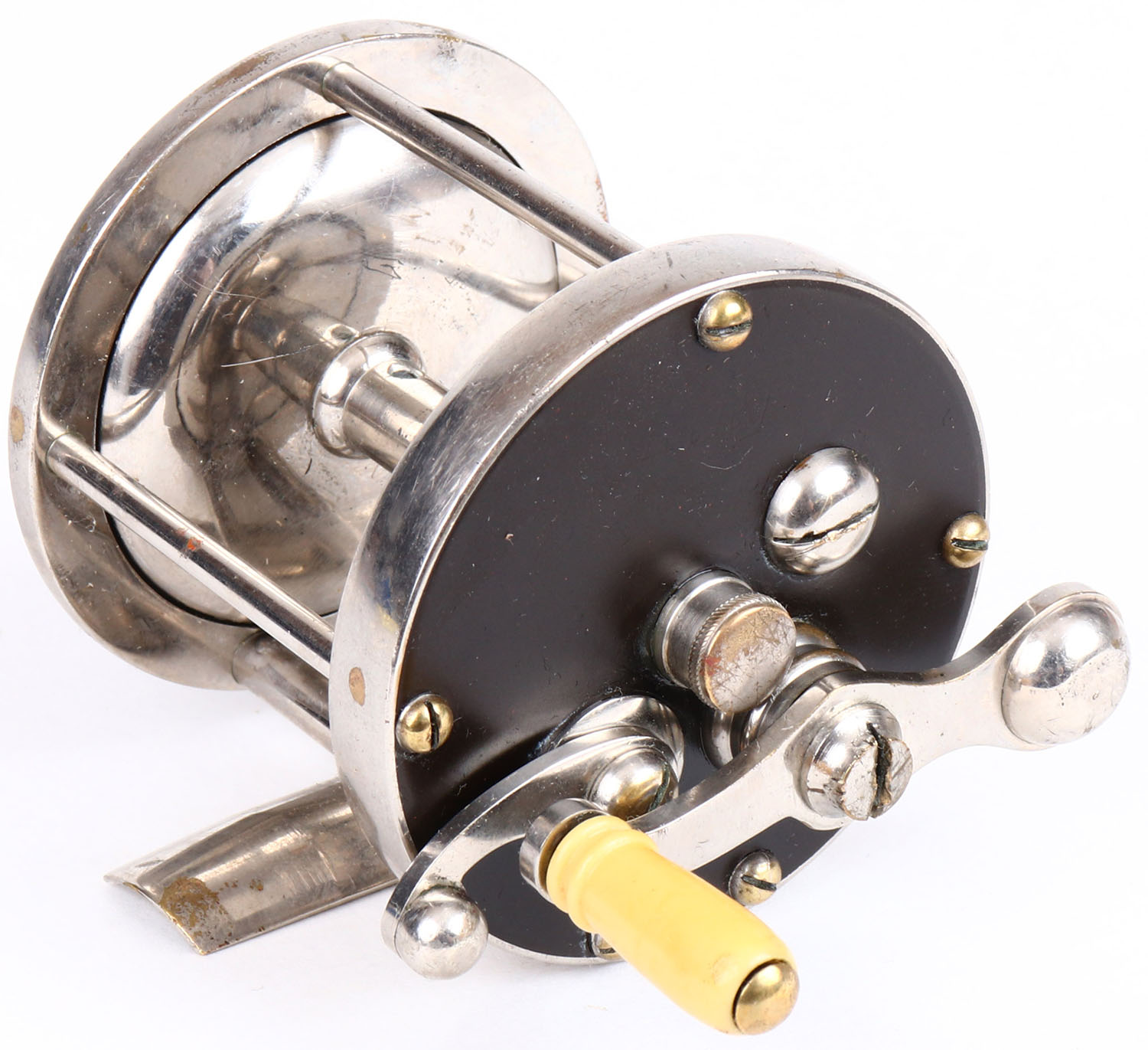King Free Spool reel, 60 yds, has single white handle, strong click. Grade: Excellent - Value: 10 to 40