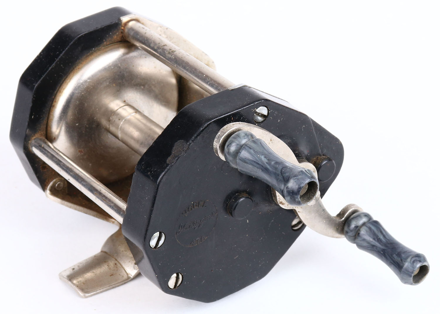 J.C. Higgins No. 47A, level wind reel, dual handle, strong click. Grade: Excellent - Value: 2 to 40