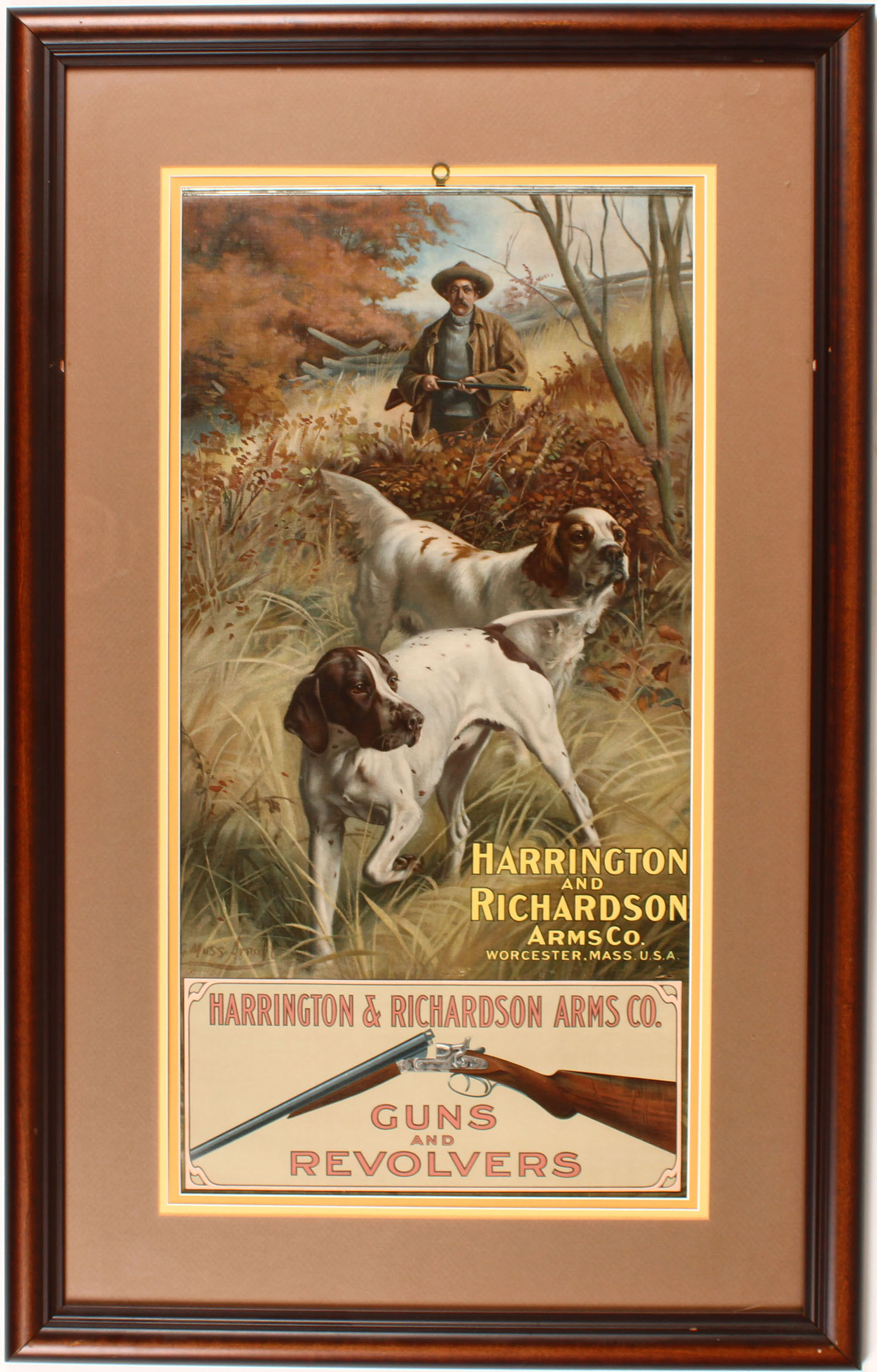 1910 Harrington and Richardson Arms Co. Calendar, 14'' x 27'', calendar has a absolutely beautiful picture of hunter holding a side by side shotgun with his two pointer by G. Muss-Arnolt, bottom of calendar has a full color image of shotgun wear the pad of pages go, no pages but the shogun is just so beautiful to look at the pages are not needed, framed & matted, calendar has both top & bottom bands, calendar is near mint & shows no wear, this near mint calendar would look great in any collection. Grade: Excellent ++ - Value: 1800 to 3000