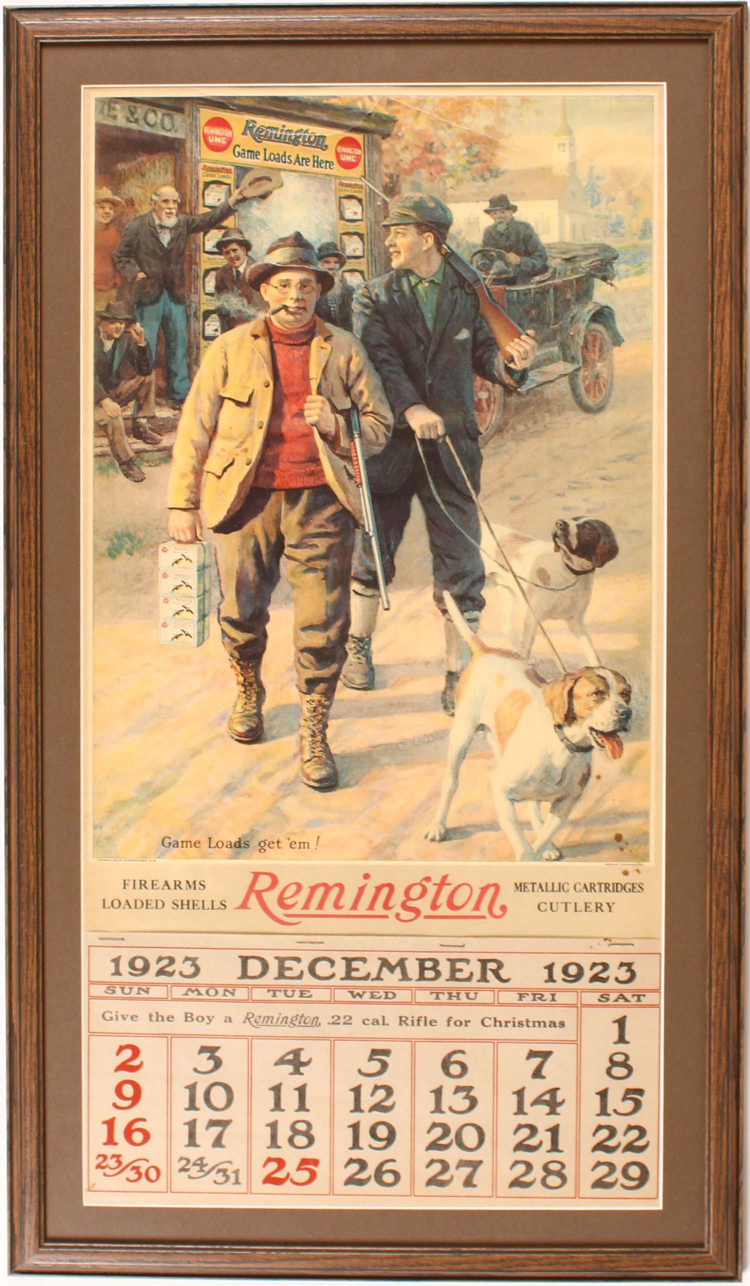 Scarce 1923 Remington Calendar pictures a wonderful full color image and Self-Portrait of Philip R Goodwin, shows two hunters walking out of a Remington Sporting Goods store carrying many 2pc shotshell boxes, shotguns, many game load boxes in background, has metal band top with metal hanger, Dec page, nice condition with stain to bottom right & a few tears to top center, 15'' x 28 3/4''. Grade: Excellent - Value: 1500 to 3000