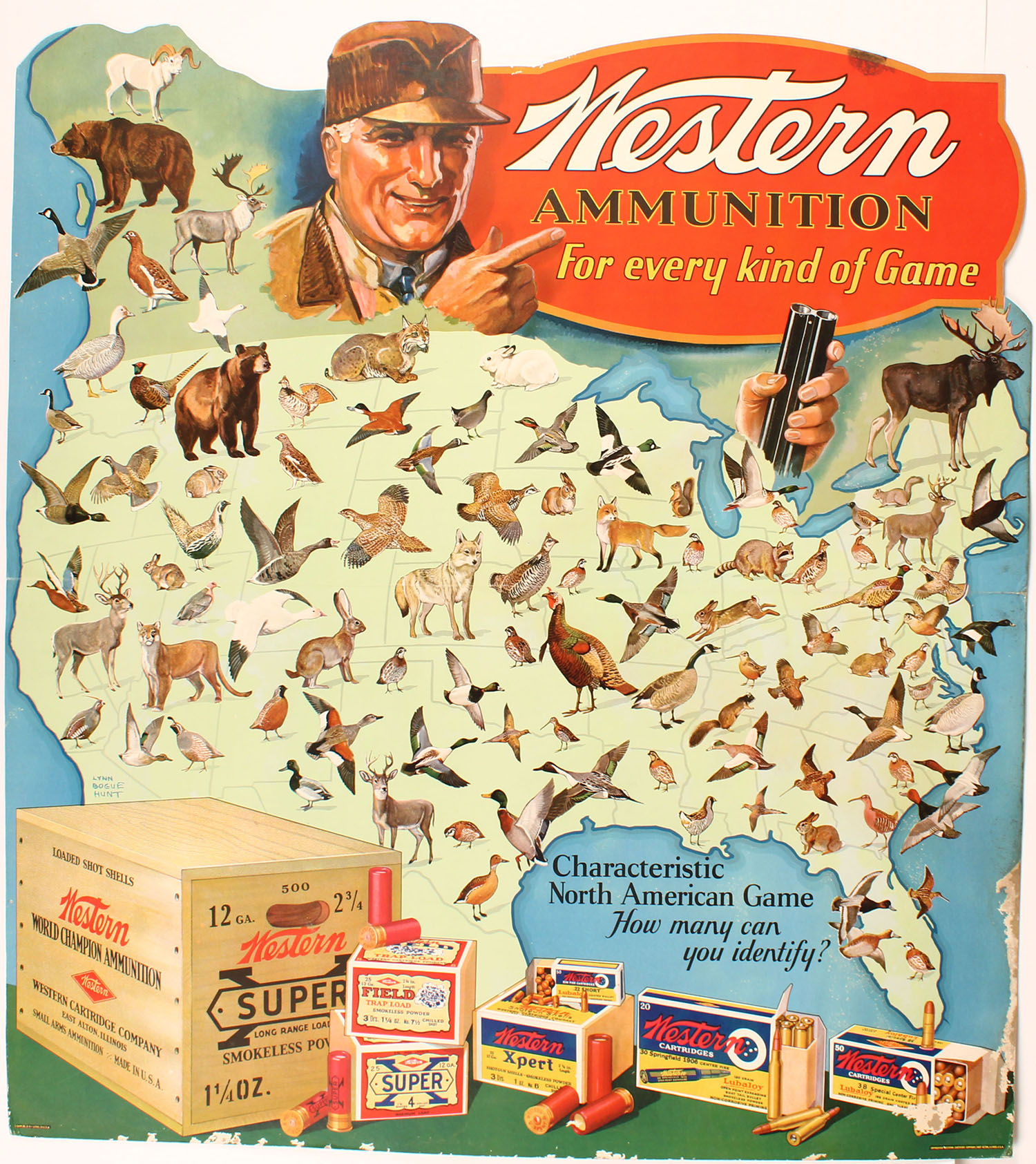 Large Western Window Display, Easel Back Diecut, pictures map of USA with many full color image of birds & animals by Lynn Bogue Hunt, 36'' x 39 1/2'', has near perfect color, shows a few rub marks to bottom edge, one stain to top otherwise MINT, has large fold out brochure on how to display in your window and a large image of the display set up in a window. Grade: Excellent - Value: 1500 to 3000