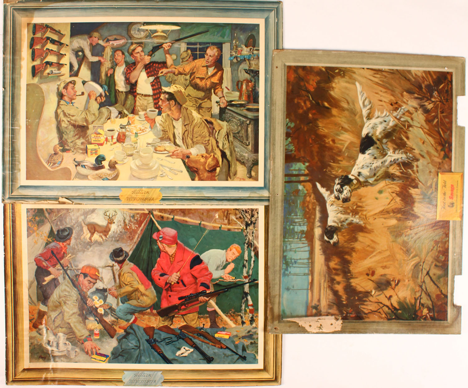 Lot of 3 Diecuts, two Western-Winchester & one Savage, pictures duck hunting & deer hunting scenes, the Savage pictures two english setters on point, all show soiling & edge wear, 28'' x 20 1/2''. Grade: Good ++ - Value: 20 to 200