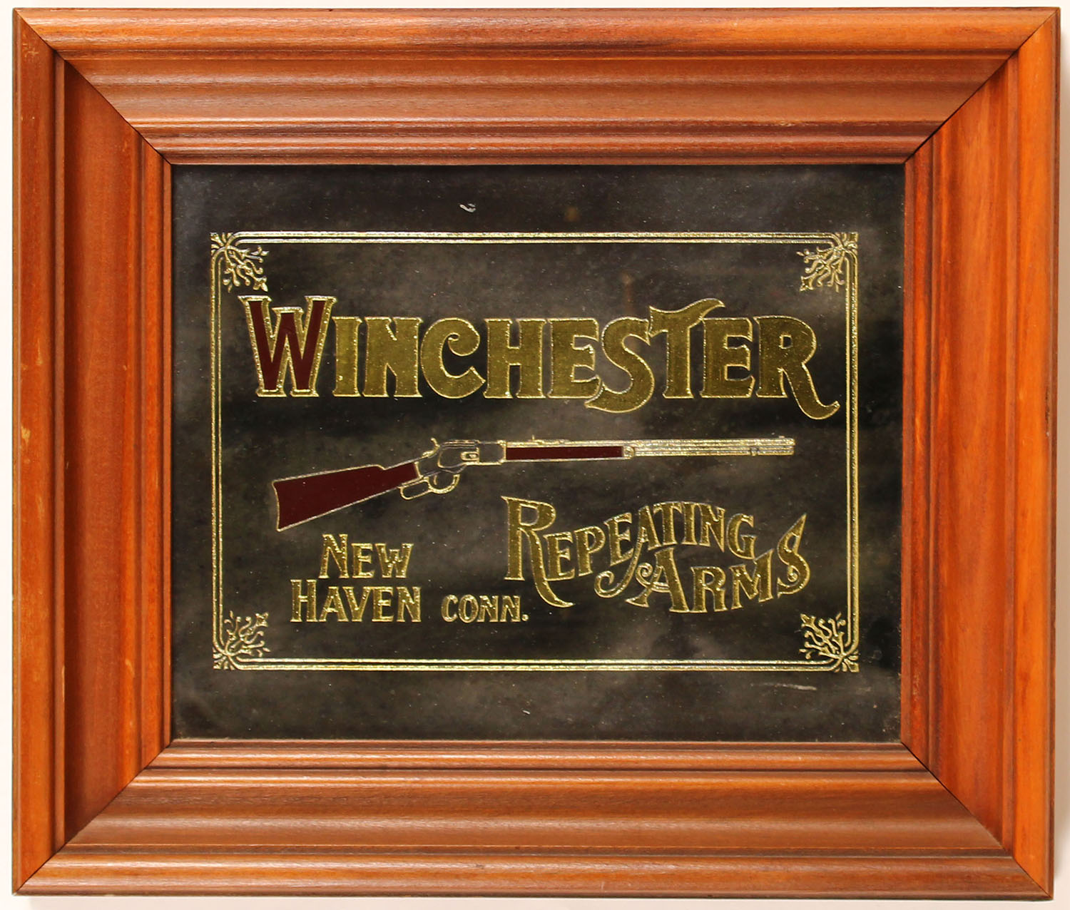 Winchester Glass Mirror advertisement, grey, gold & brown, framed, 13 1/2'' x 12''. Grade: Excellent ++ - Value: 30 to 200