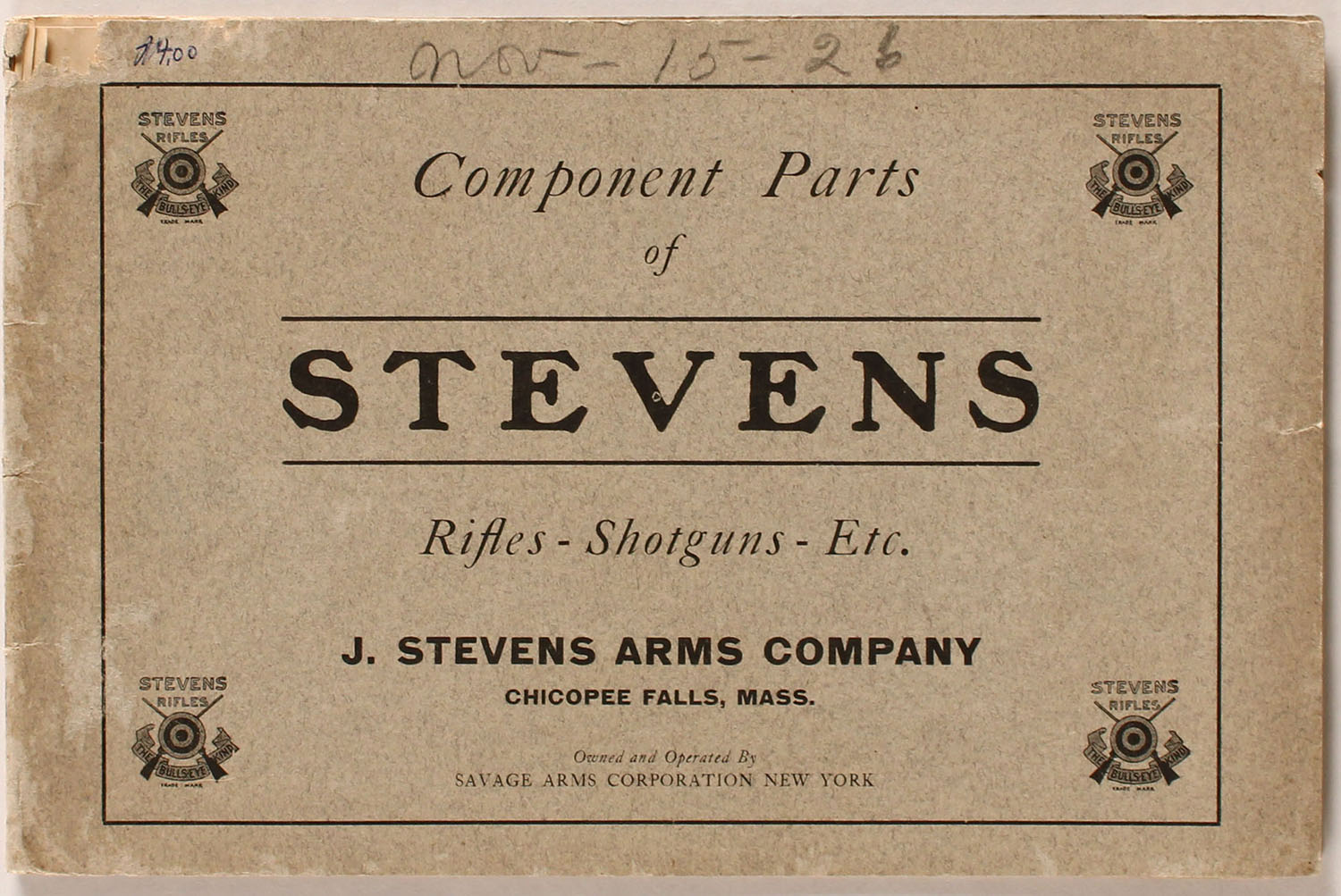 1926 J. Stevens Arms Co. Component Parts Price List, Rifles, Shotguns & Pistols, all models with complete parts breakdown are pictured, about 35 pages, 9'' x 6''. Grade: Very Good + - Value: 2 to 40