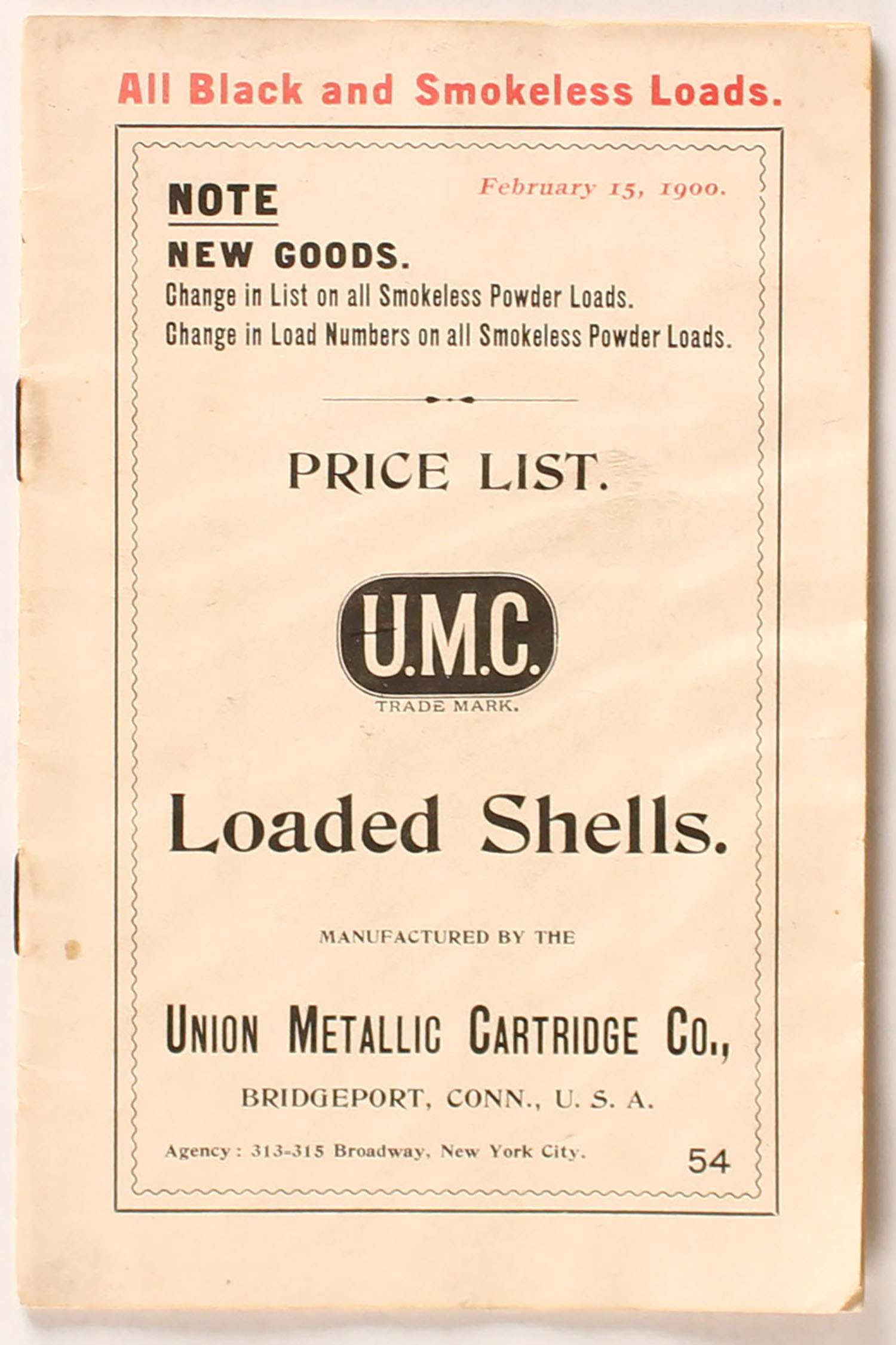 1900 UMC Price List, 23 pages, 4 1/4'' x 6 1/2'', shows one window shot shell. Grade: Very Good ++ - Value: 6 to 50