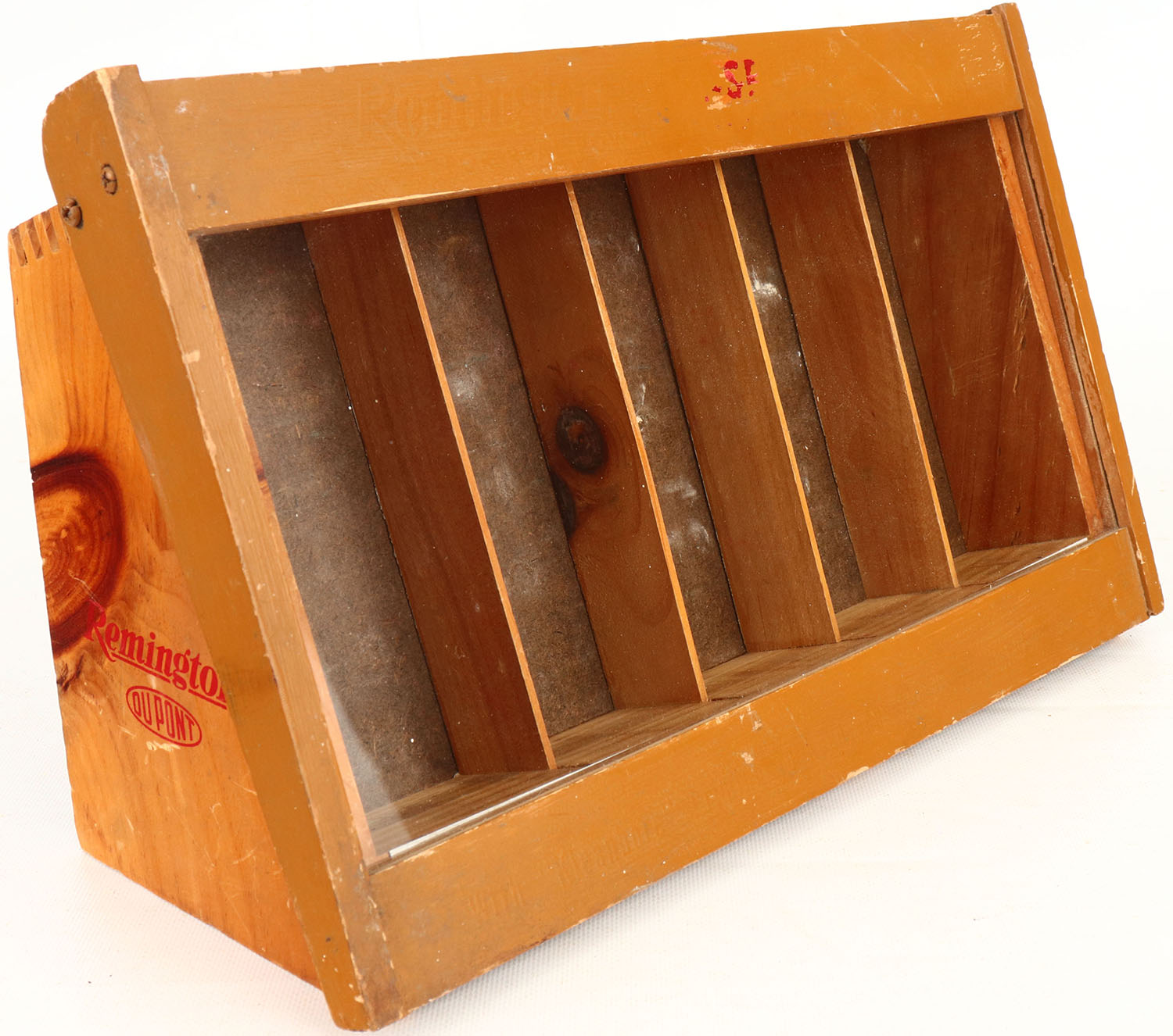 Remington High-Velocity 22's display, wood has been painted over on the front, right side has on piece of the back panel broken off but still present. Grade: Good - Value: 50 to 200