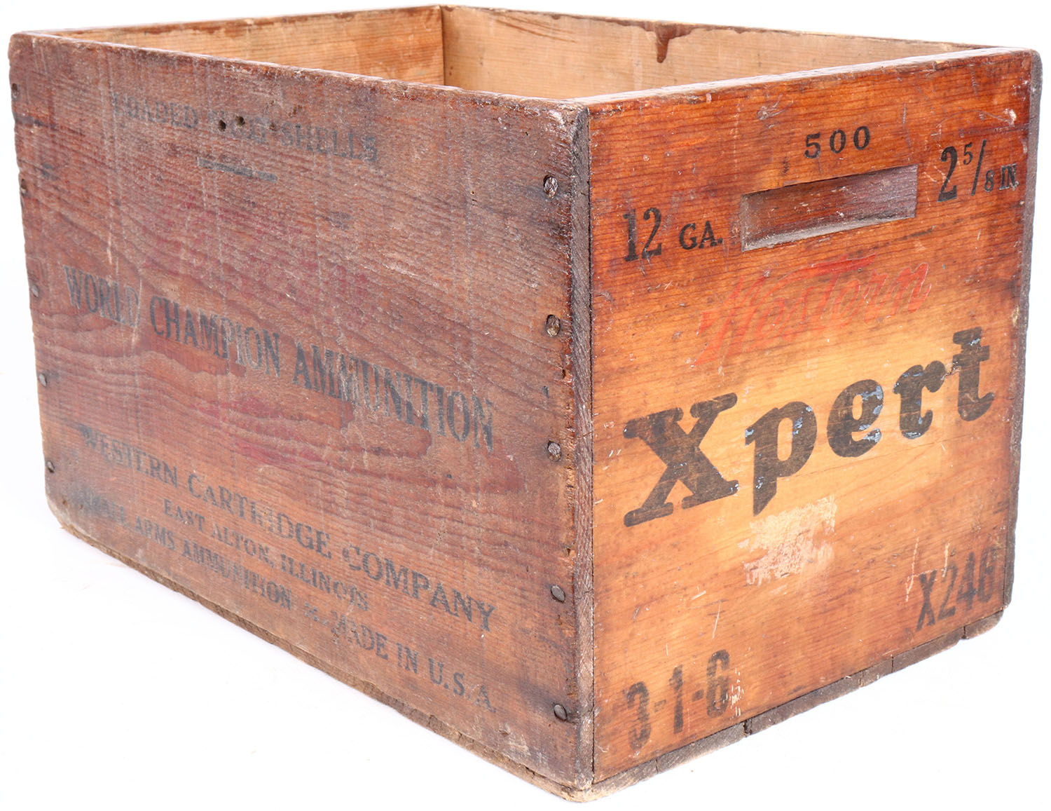 Western Xpert, 12 Ga., 2 5/8'', 6 Ch., nail construction wood shipping crate, black & red print is solid, and the crate has age soiling. Grade: Very Good - Value: 10 to 40
