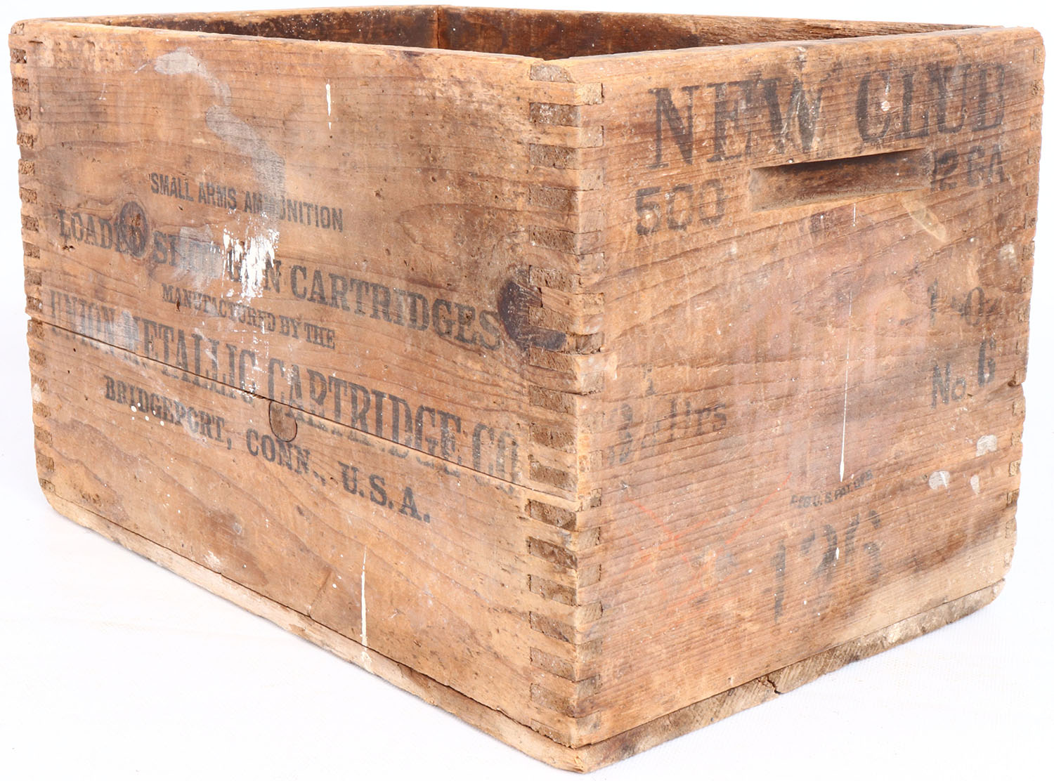UMC New Club, 12 ga., tongue and groove construction wood shipping crate, black print has heavy fading, crate has age soiling. Grade: Very Good - Value: 16 to 40