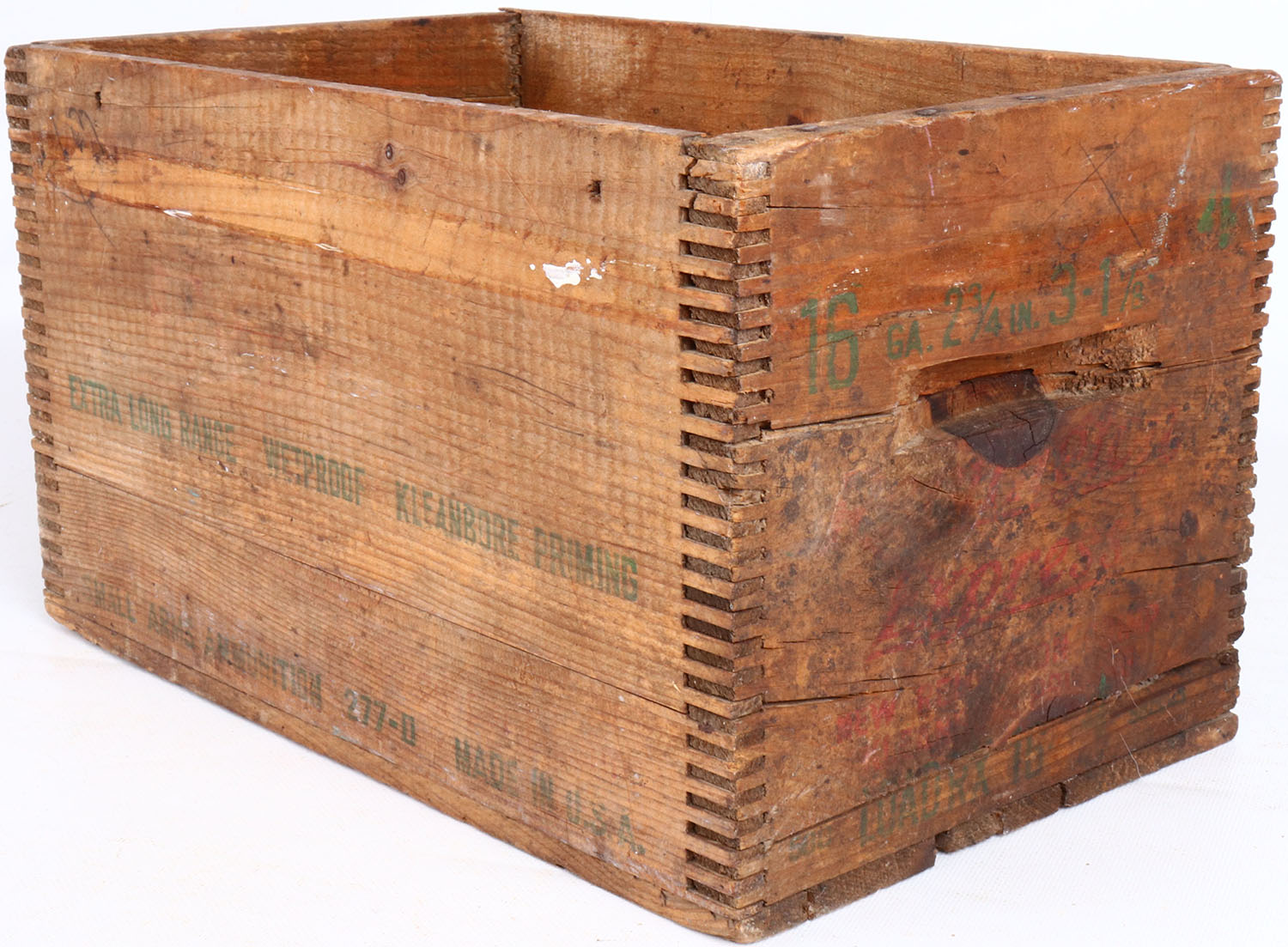 Remington, 16 Ga., tongue and groove construction, red, & green print has faded and crate has age soiling. Grade: Very Good - Value: 6 to 40