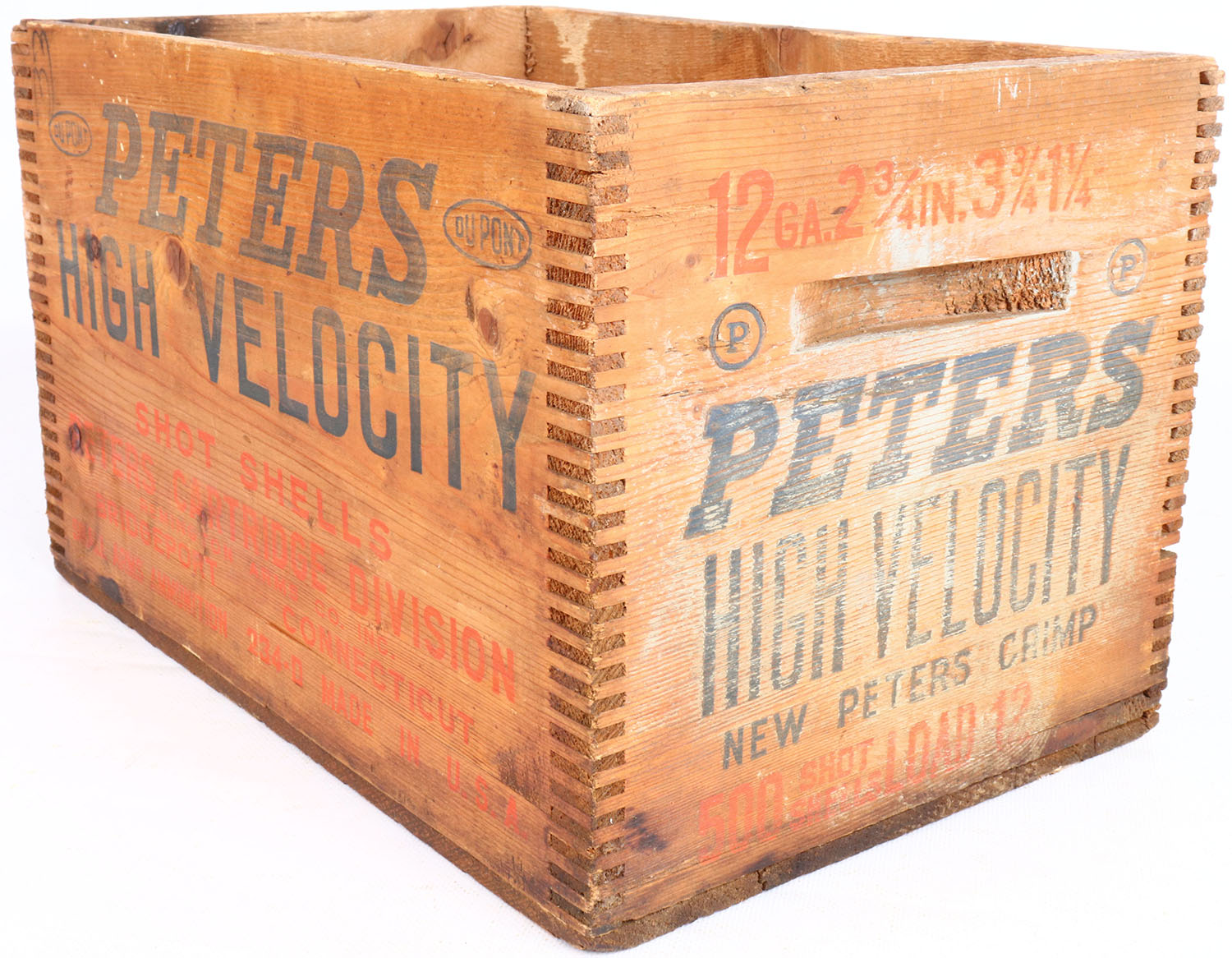 Peters High Velocity 12 ga., tongue and groove construction, orange & blue print has some fading, crate has age soiling. Grade: Very Good + - Value: 20 to 60