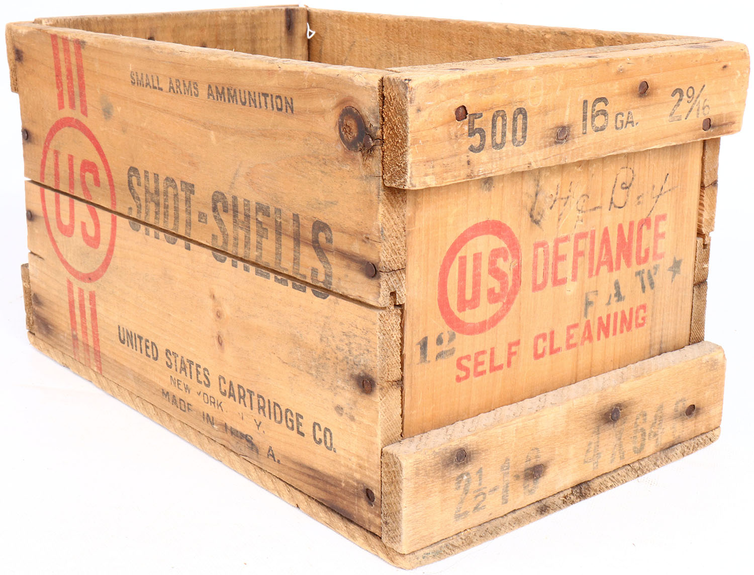 US Defiance, 16 ga., Smokeless, tongue and groove construction wood shipping crate, red & black print is bright and clean, crate is solid. Grade: Excellent - Value: 10 to 50