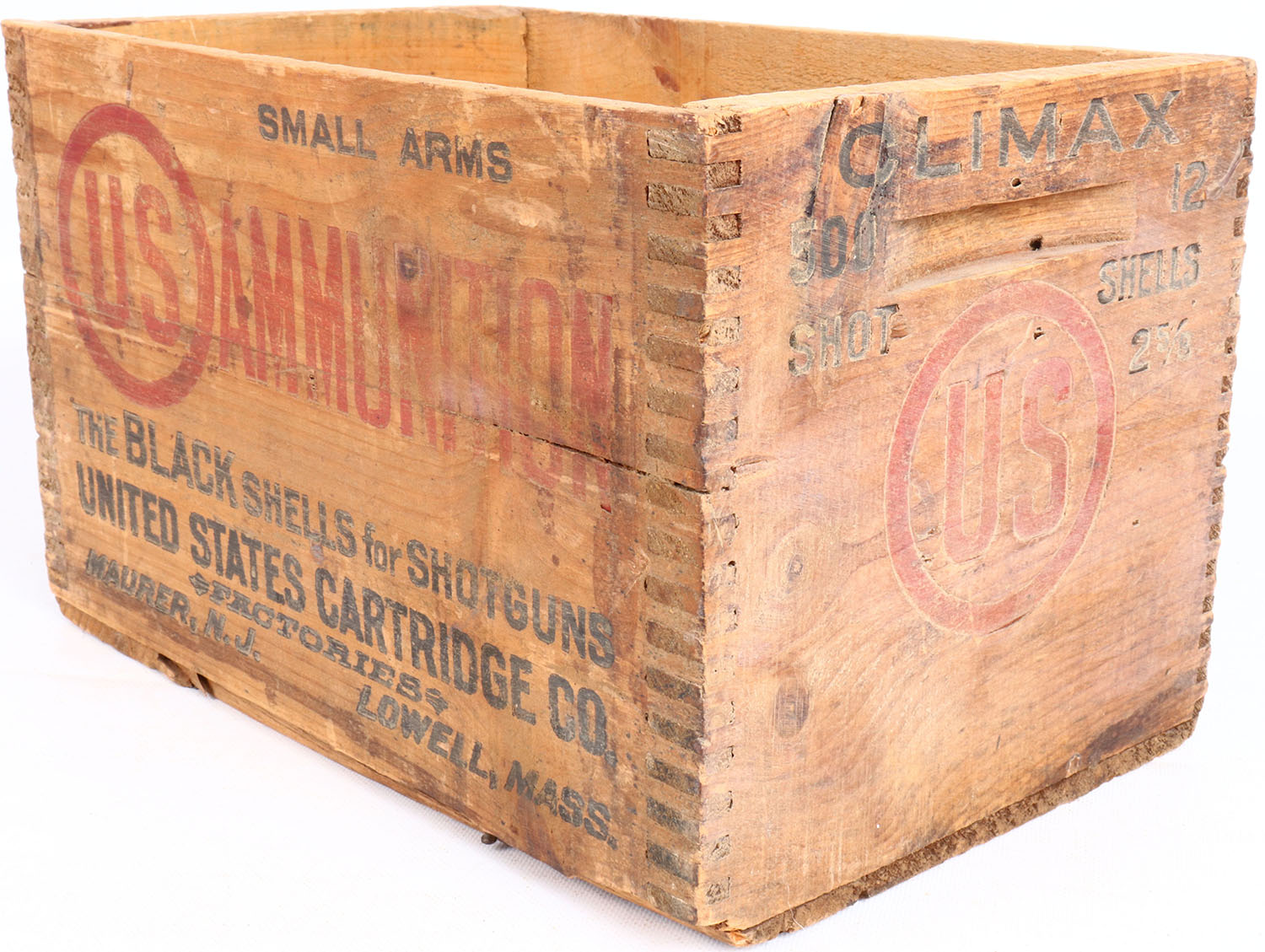 US Climax, 12 ga., Smokeless, tongue and groove construction wood shipping crate, red & black print is fading, crate is solid. Grade: Very Good ++ - Value: 2 to 40