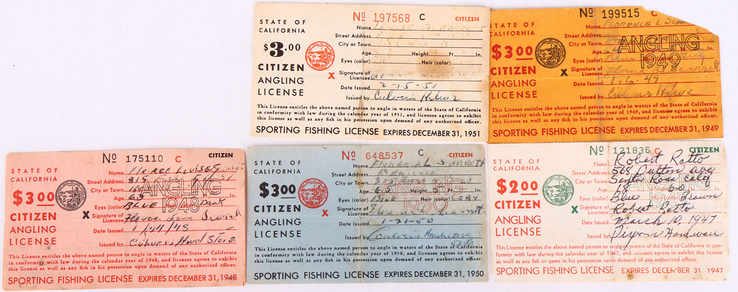 Lot of 4 California Fishing License, 1947, 1949, 1950 and 1951. Grade: Excellent - Value: 10 to 50