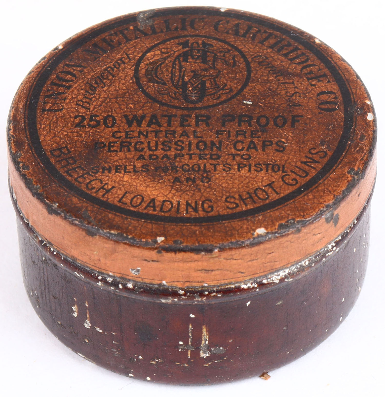 UMC doghead logo primer tin, Partial, some age soiling, still solid. Grade: Very Good + - Value: 6 to 40