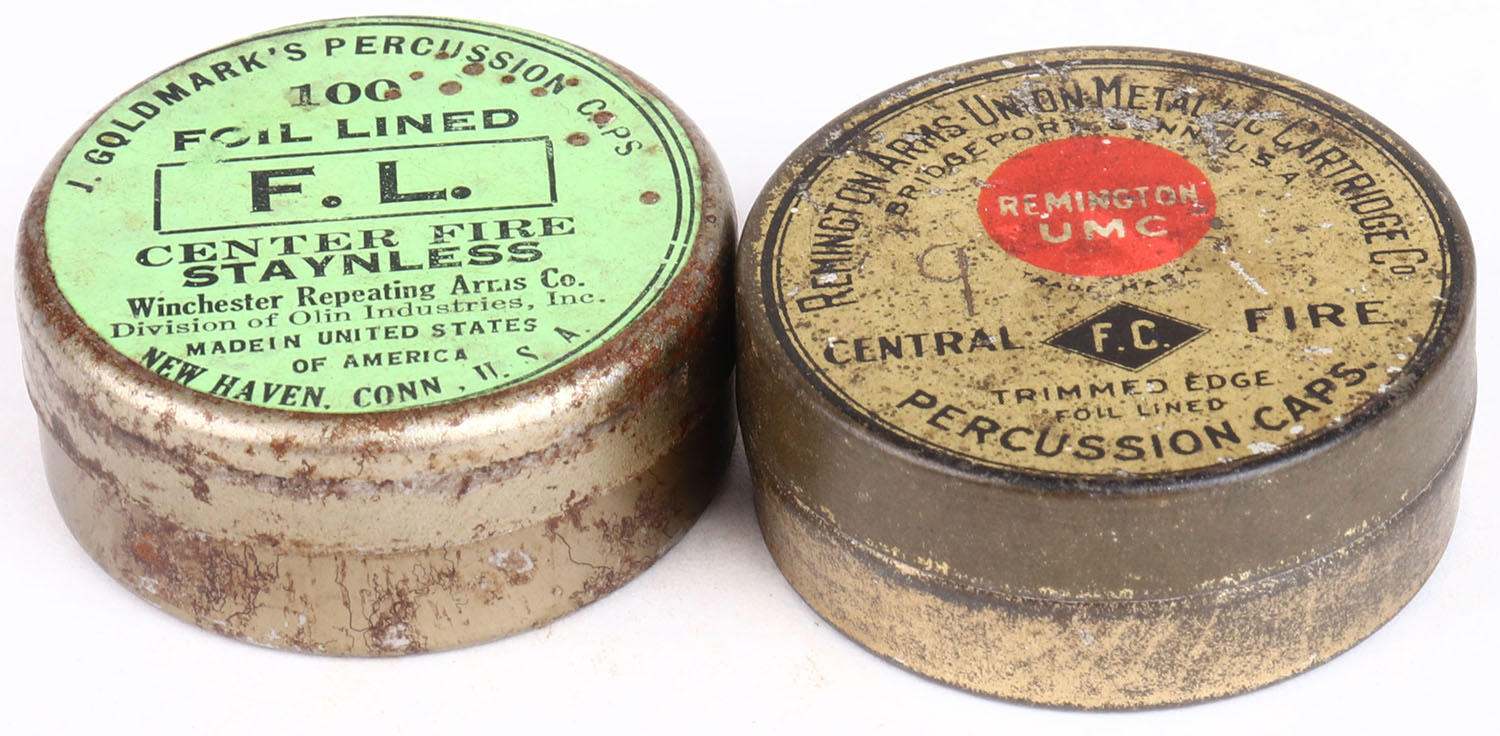 Lot of 2 percussion caps tins, Partial, has rust and age soiling. Grade: Very Good ++ - Value: 6 to 60