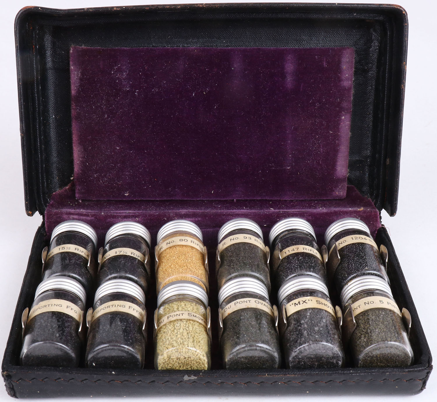 RARE! Very Early set of rifle sporting powder, set of 12 jar with various powder type for a salesman to display maybe, in a very nice black leather case with soft purple felt, 7'' x 4''. Grade: Excellent - Value: 50 to 500