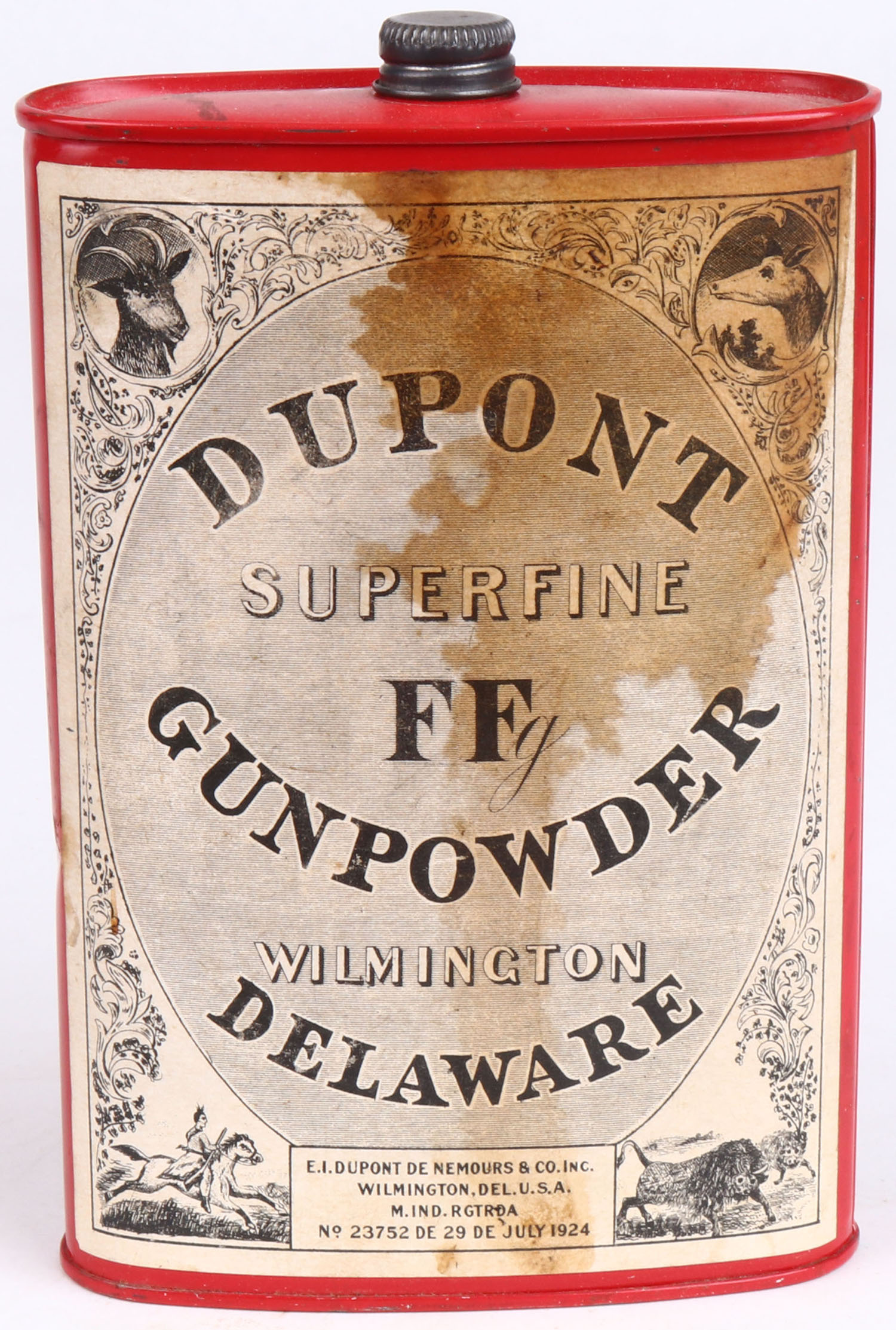 DuPont FFg Gunpowder tin, Empty, has age soiling Grade: Very Good + - Value: 10 to 40