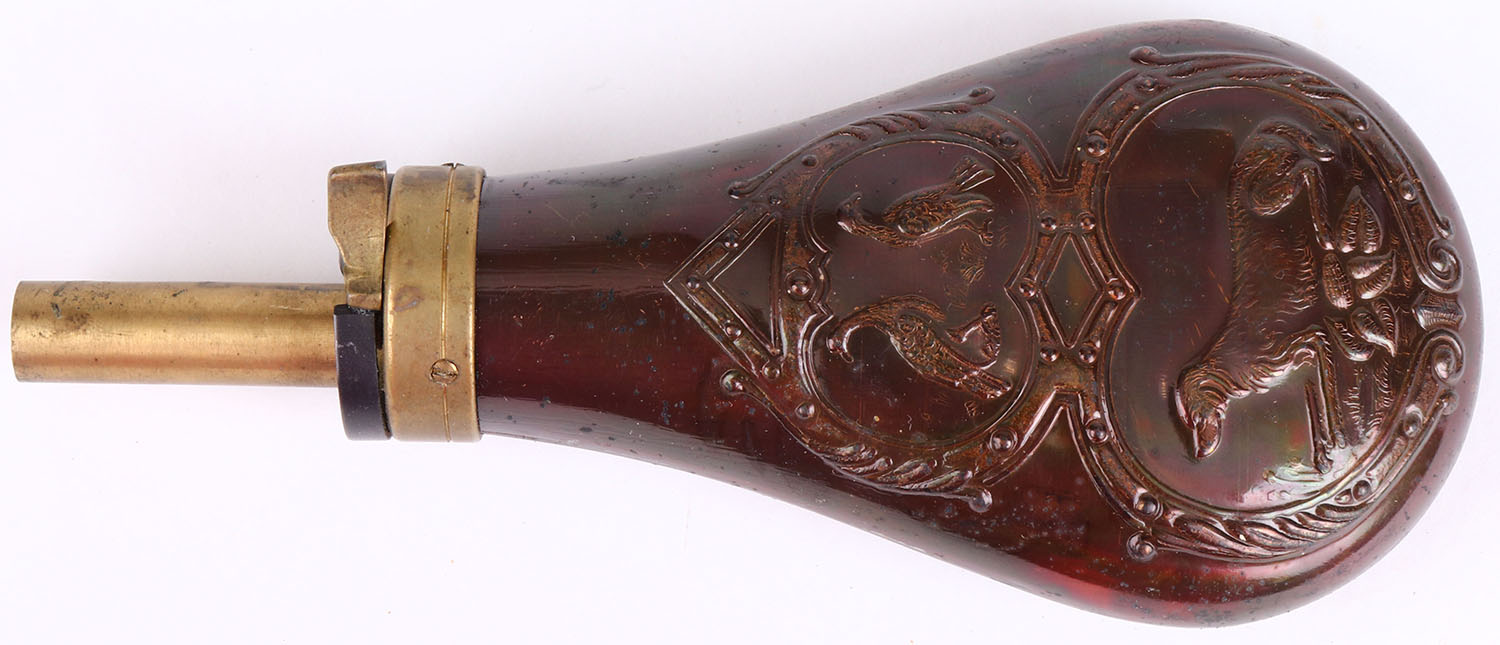 Small Brass powder flask, beautiful design, bright and clean. Grade: Excellent - Value: 10 to 50