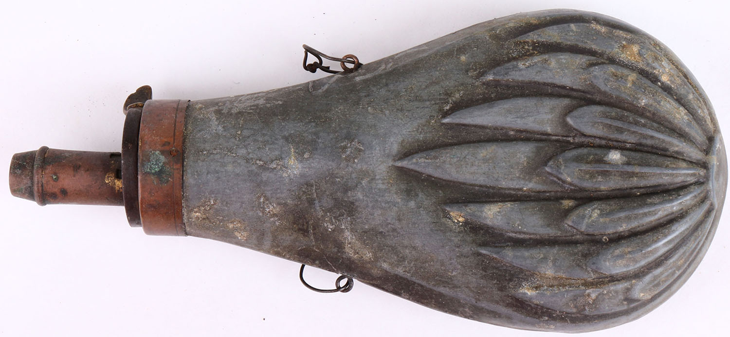 Metal powder flask, beautiful design, age soiling. Grade: Very Good - Value: 10 to 50