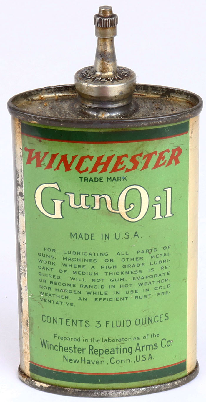 Winchester Oil Tin, Gun Oil with lead spout & lead cap, partial , solid. Grade: Excellent - Value: 200 to 400
