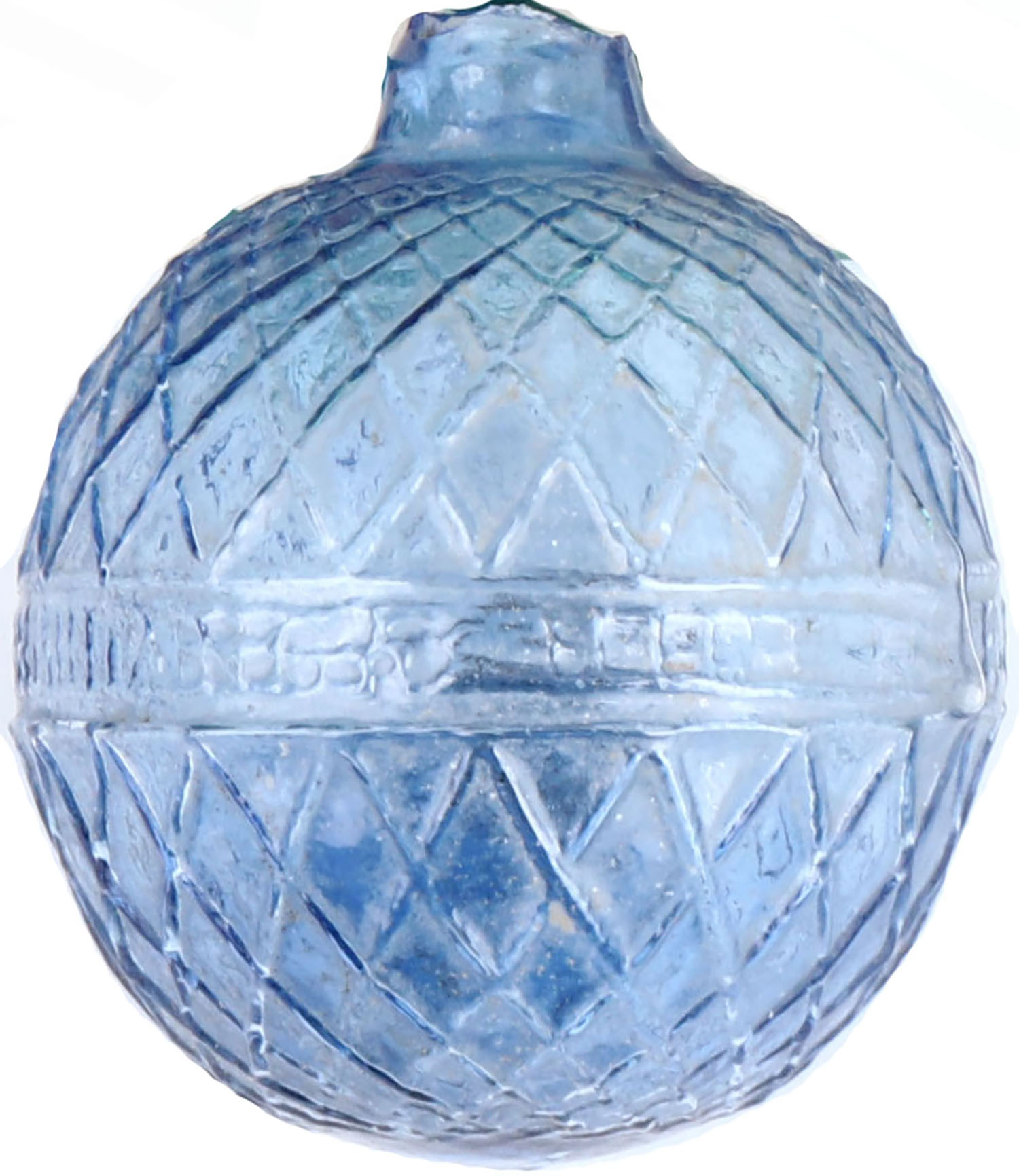 RARE! Blue Glass Target Ball, net design, 2 5/8'' dia., high neck, circa 1880-1900, has age soiling. Grade: Excellent - Value: 200 to 700