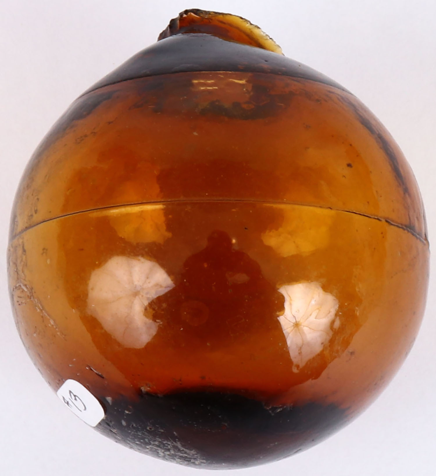 RARE! Medium/dark amber Glass Target Ball, 5 piece mold, 2 5/8'' dia., low neck, circa 1880-1900. Grade: Excellent ++ - Value: 200 to 600