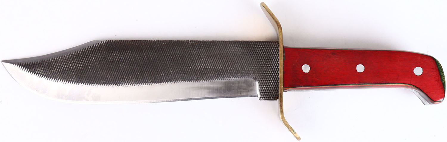 Large Unmarked knife, 9 1/2'' blade, full hilt, wood handle, bright and clean. Grade: Excellent - Value: 40 to 200