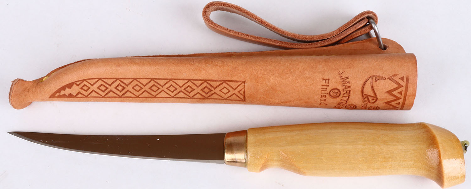 J, Marttini Fixed blade knife, has wood handle, bright and clean, 4'' blade has original leather sheath. Grade: Excellent ++ - Value: 16 to 60