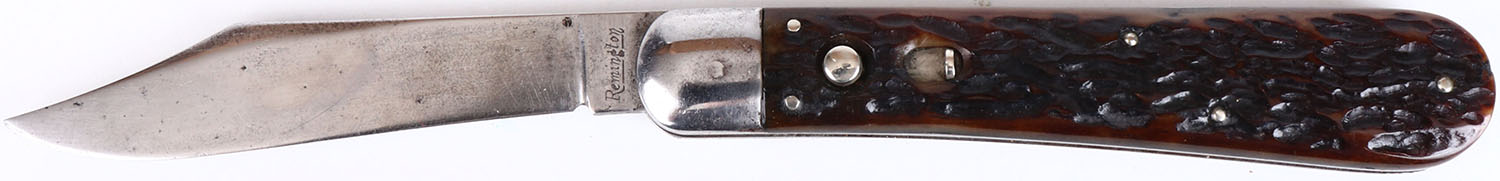 RARE!!! Early Remington folding knife, 4'' blade, #R2403, blade releases to a locked position when you push the button, stag handle, has the ability to lock the blade into place, blade and handle are bright and clean, well marked. Grade: Excellent - Value: 400 to 1000