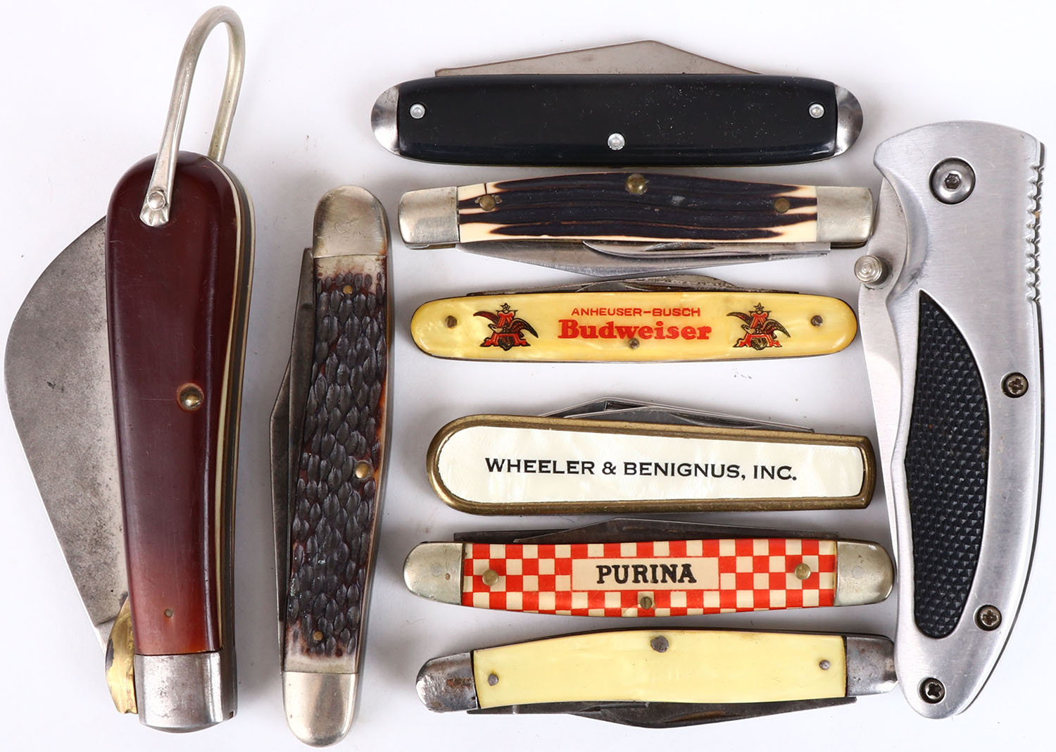 Large lot of folding knives, some age soiling but all still solid. Grade: Very Good + - Value: 20 to 100