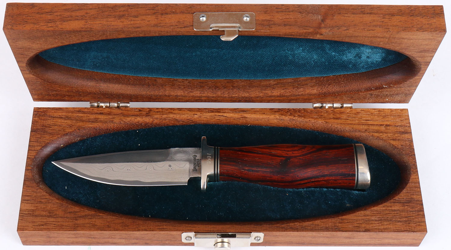 RARE! Browning Model 3816 Double edged Damascus Hunter fixed blade knife, cocobolo wood handle, blade is 3 5/8'' long, in orignal wood box and with orignal shipping box, 1 of 1000, #507. Grade: MINT - Value: 400 to 800