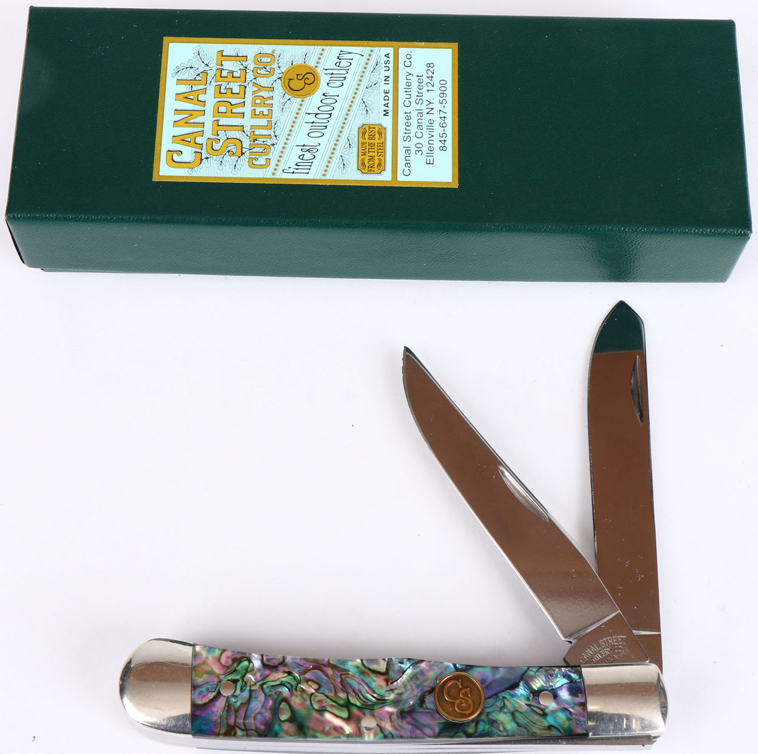 Canal Street Cutlery Co folding knife, 4 1/8'' blade, beautiful green abalone handle, in original box, 2011 circa. Grade: Excellent ++ - Value: 40 to 150